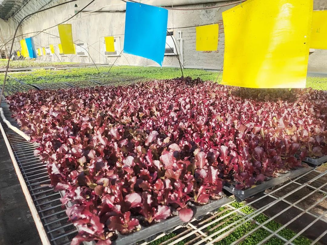 北京兴农天力农机服务专业合作社集约化育苗场内的紫叶生菜种苗。