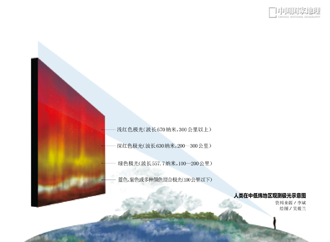 这需要我们对极光颜色的空间分布有一个认识,在不同高度,极光的颜色不同。极光产生的高度范围为距离地面的80—1000公里,主要集中在90—400公里。在300公里以上,是以波长670纳米的浅红色为主;200—300公里,以波长630纳米的深红色为主;100—200公里,以波长557.7纳米的绿色为主;100公里以下,则是蓝色、紫色或多种颜色混合成的深红色。