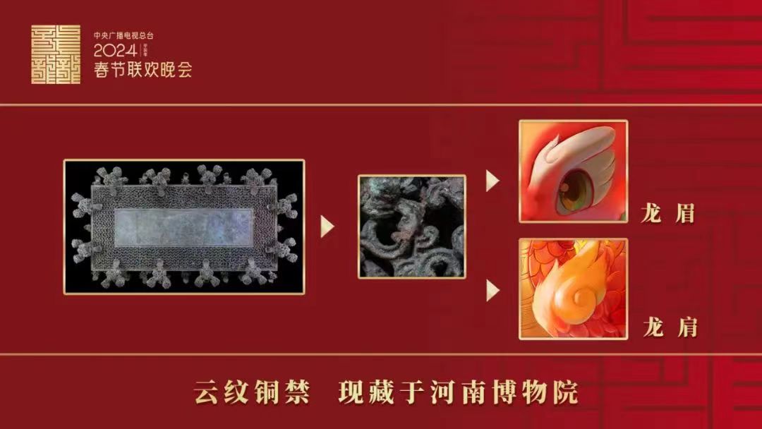 总台2024龙年春晚吉祥物形象,突出呈现吉祥如意、平安幸福的美好寓意。2024龙年春晚吉祥物从源远流长的中华优秀传统文化中寻找设计灵感,从现实生活中汲取情感共鸣,不仅饱含着传统文化中生肖龙的意蕴和美感,也展现出新时代中国人昂扬向上的精气神。“龙辰辰”从出土于河南偃师二里头遗址的绿松石龙形器中提取独具上古特色的龙鼻作为设计元素,龙脊结构、龙腹纹来源于最早记载“中国”二字的西周何尊侧面的四道扉棱和云雷纹,眉弓和龙肩上的装饰取自河南博物院收藏的云纹铜禁纹饰,精美别致,增添了吉祥物的趣味和古韵。