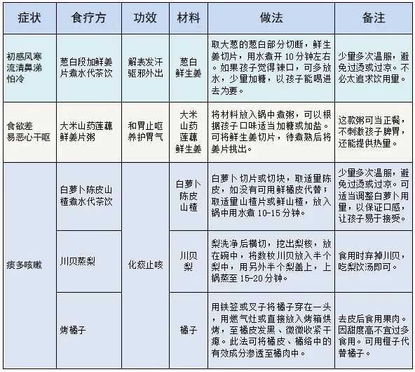 在清淡饮食、保证营养的基础上,针对不同的症状,可以试试以下食疗方,尤其适用于疾病初期、恢复期的孩子。
