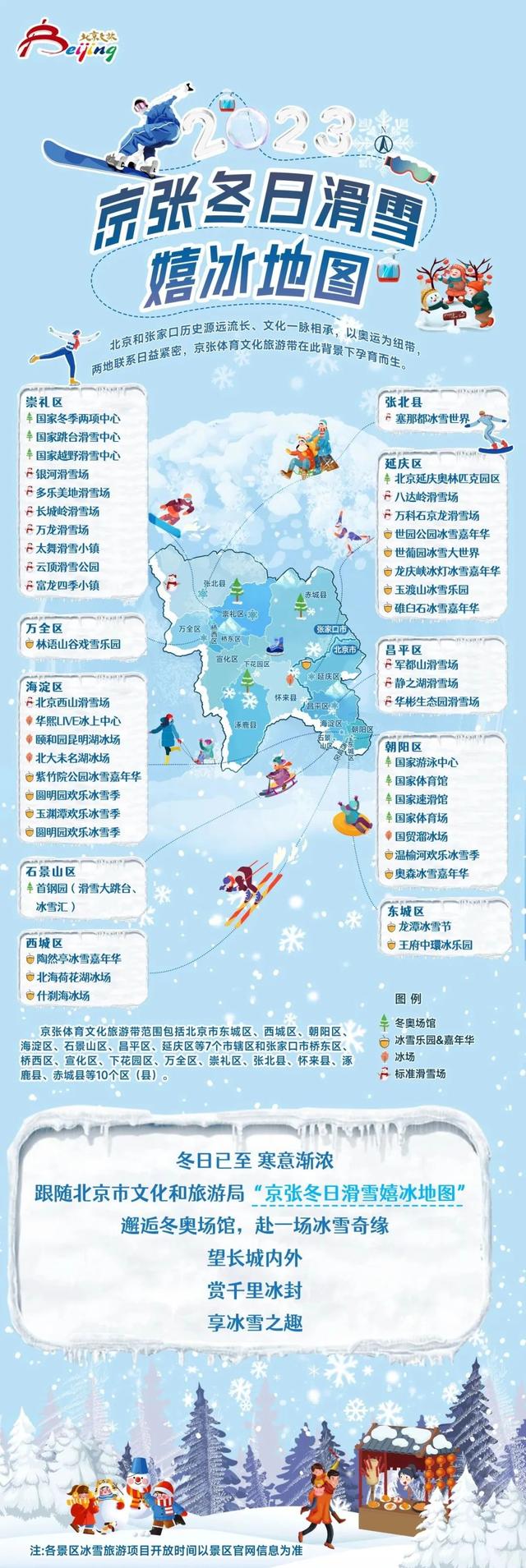 冬日已至,寒意渐浓。跟随北京市文化和旅游局《2023京张冬日滑雪嬉冰地图》,邂逅冬奥场馆,赴一场冰雪奇缘,望长城内外,赏千里冰封,享冰雪之趣。