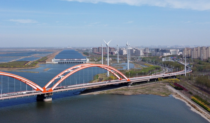 2022年4月14日,在天津市滨海新区中新天津生态城拍摄的蓟运河口风电场。新华社记者 赵子硕 摄