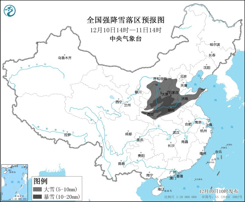 预计12月10日14时至12月11日14时,内蒙古河套地区、陕西中北部、山西、北京西南部、河北中南部、山东中西部和山东半岛、河南中北部等地有大雪,其中,陕西中部、山西中南部、河南北部、河北西南部、山东西南部等地部分地区有暴雪(10~20毫米)。上述部分地区新增积雪深度4~10厘米,局地可达12~15厘米。