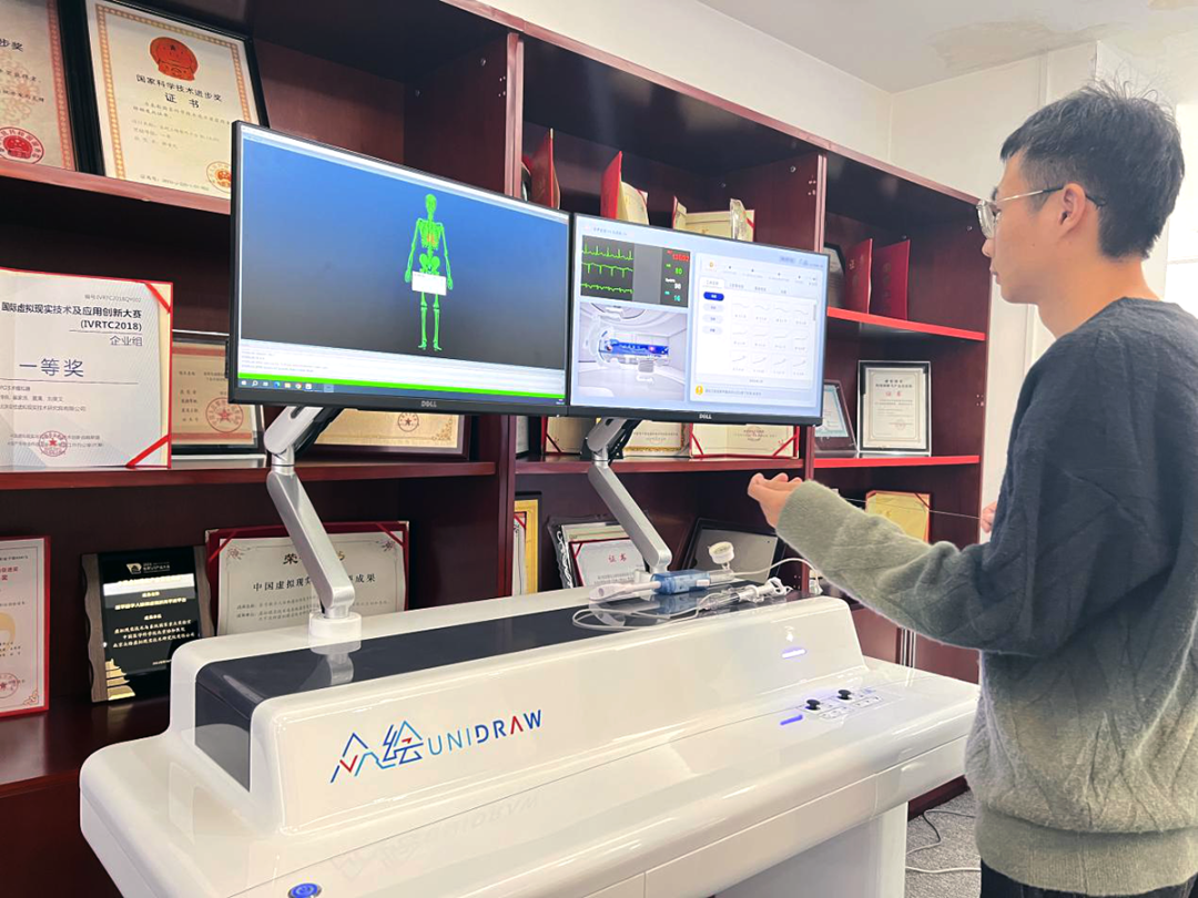北京众绘虚拟现实技术研究院有限公司(以下简称“众绘”)是此次入选的企业之一。走进众绘公司展厅,这里宛如一个综合手术室,心脑血管支架、造影、气管插管、穿刺、腹腔镜……常规“手术”在这里都可以模拟。众绘是一家专注于个性化医疗仿真智能设备研发、制造、销售和服务的高新技术企业,产品主要应用于医疗领域的手术模拟器。北京协和医学院、北京大学口腔医学院、四川大学华西口腔医学院等口腔医学院都用到了众绘的口腔数字化虚拟仿真培训系统。