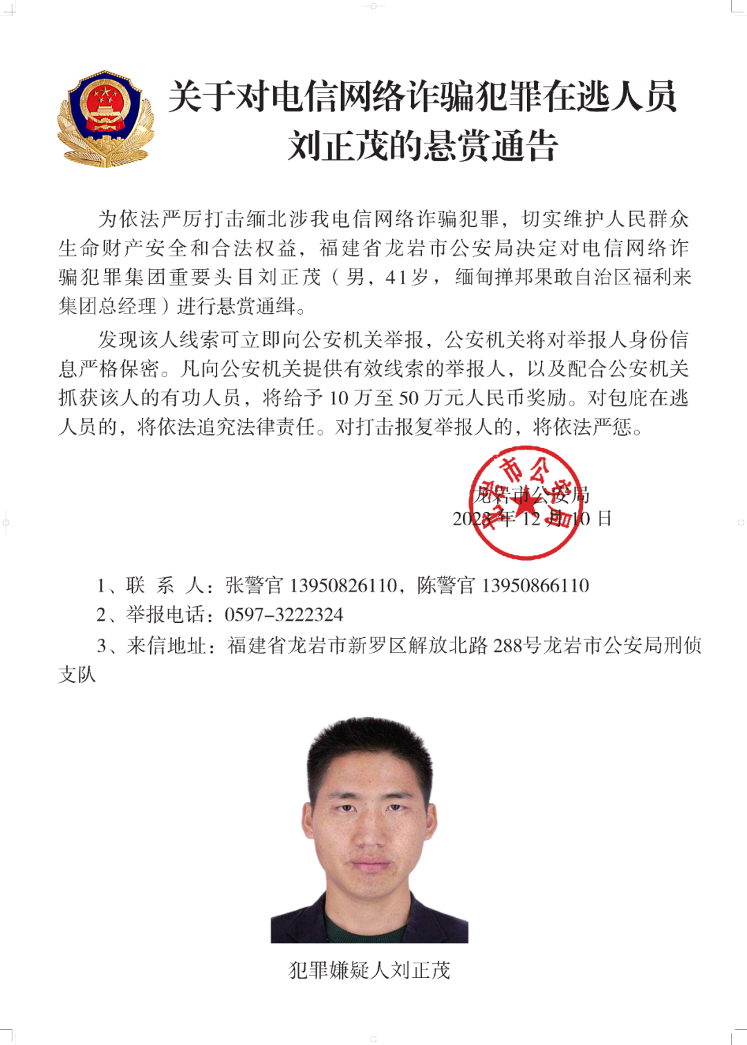 为依法严厉打击缅北涉我电信网络诈骗犯罪,切实维护人民群众生命财产安全和合法权益,辽宁省大连市公安局决定对白所成、白应苍(又名李云晨)、白应兰(又名李梦娜)进行公开悬赏通缉;福建省泉州市公安局决定对魏怀仁、魏榕(又名陈榕)、魏青松(又名杨松)进行公开悬赏通缉;福建省龙岩市公安局决定对刘正祥、刘积光(又名李华光)、刘正茂进行公开悬赏通缉;重庆市公安局决定对徐老发(又名徐发启)进行公开悬赏通缉。