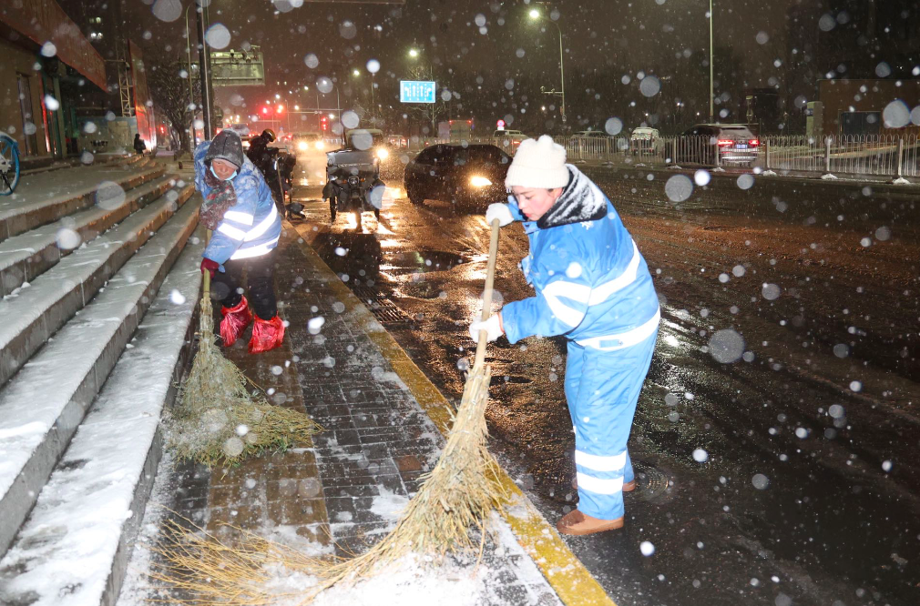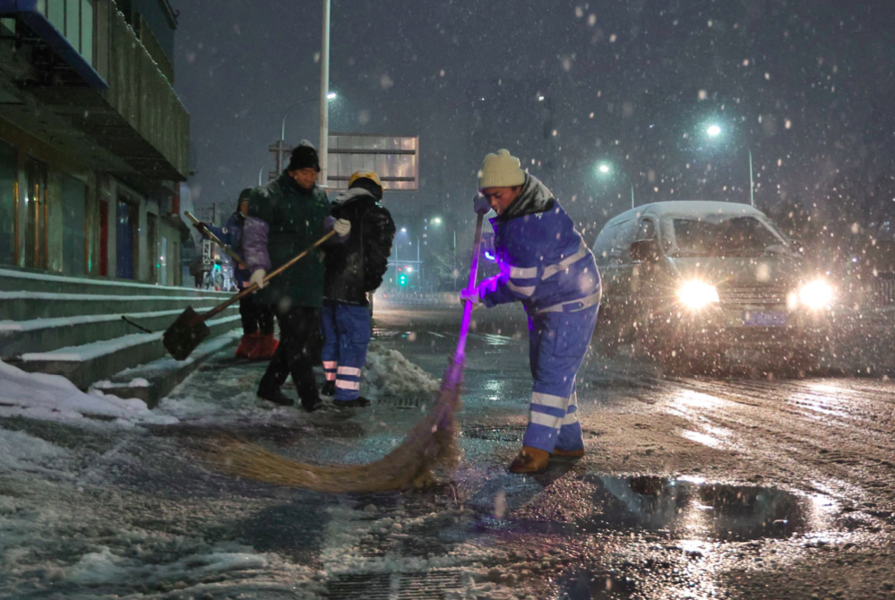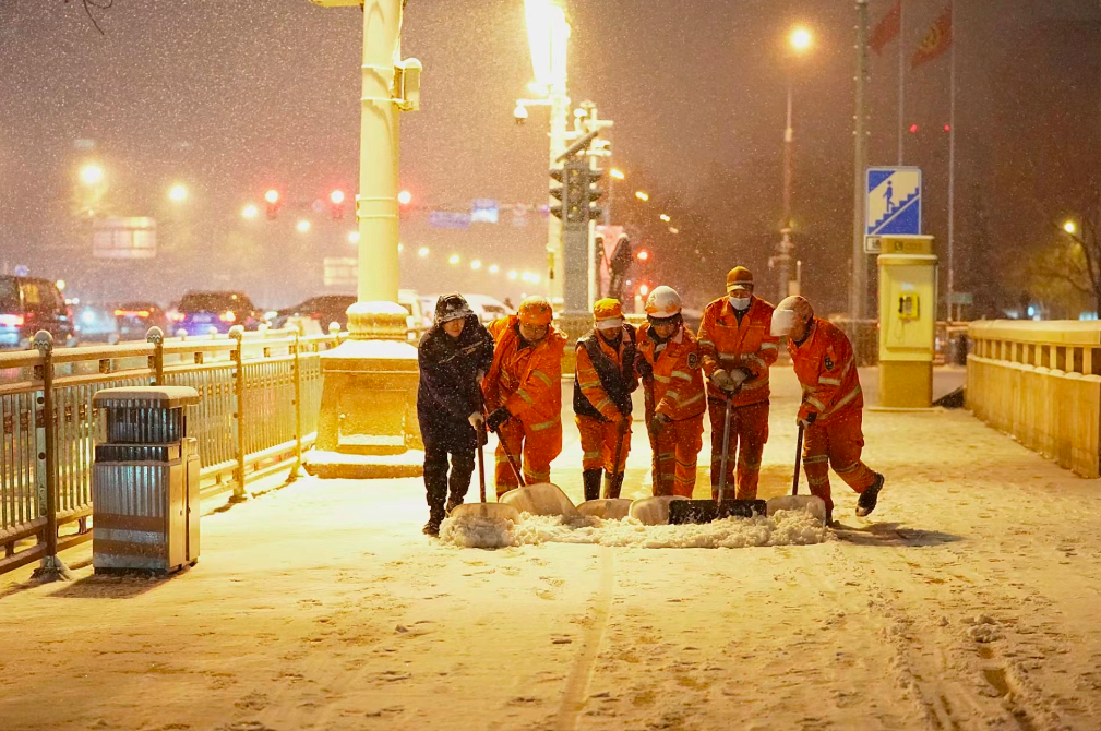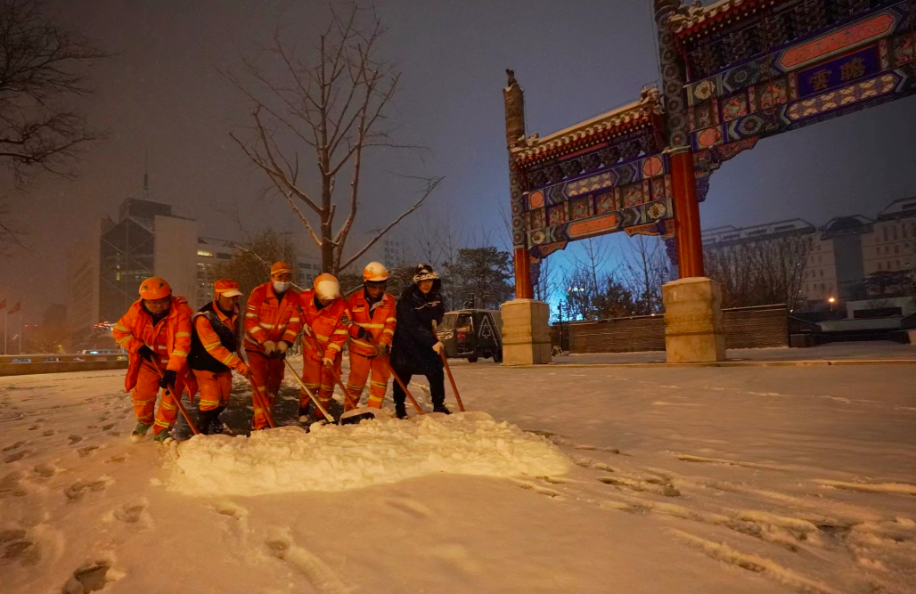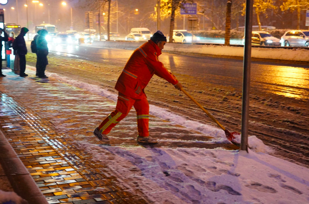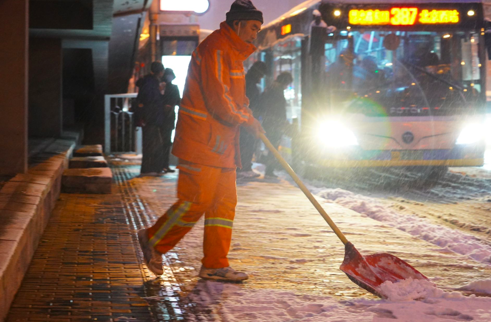 通州京环公司工作人员冒雪清理公交站等处的积雪,以方便附近居民安全出行。