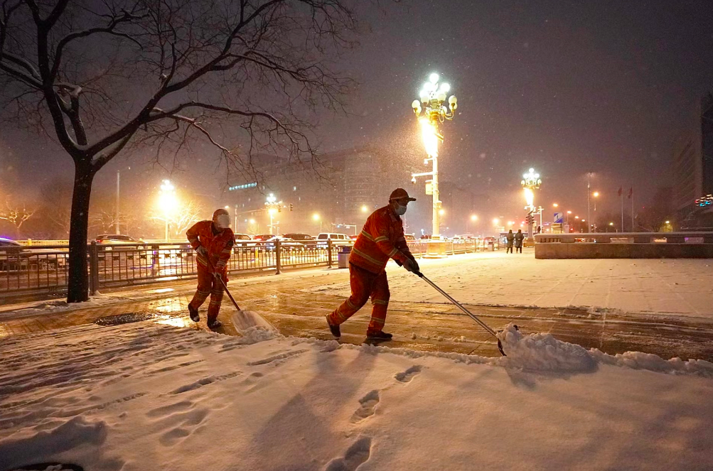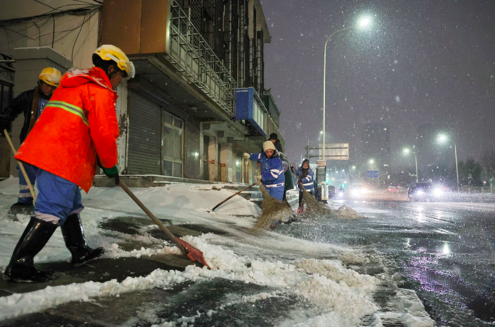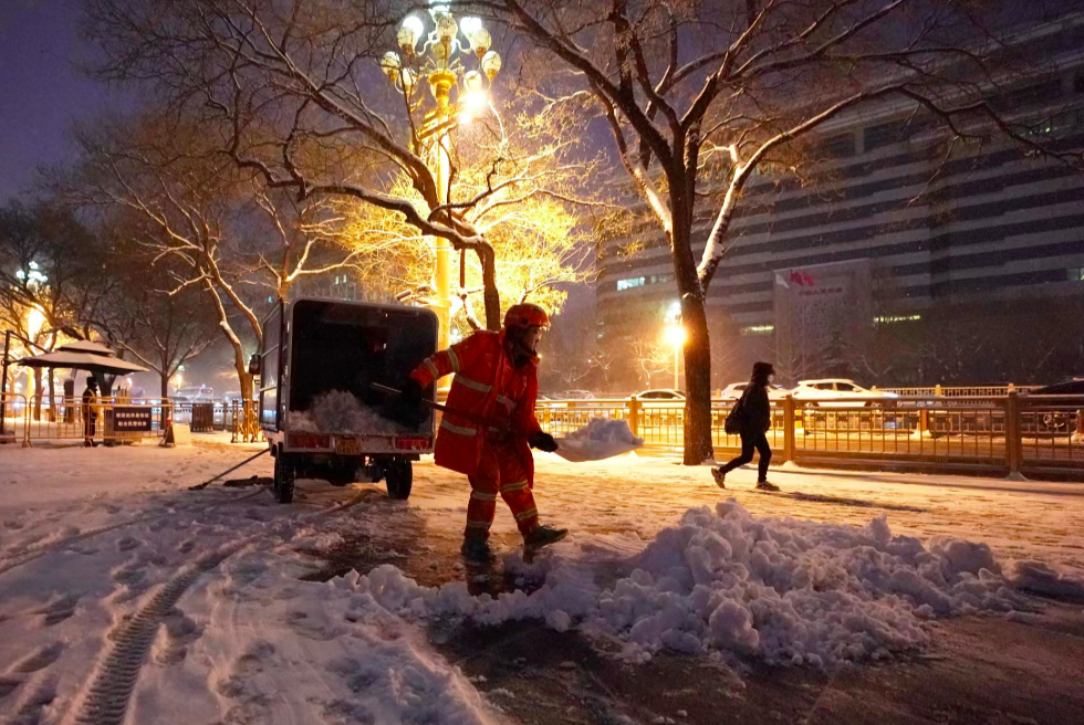 12月10日,北京迎来今冬首场降雪。11日早上天未亮,环卫工人赶在早高峰到来之前清扫公交站台上的积雪,方便乘客候车。