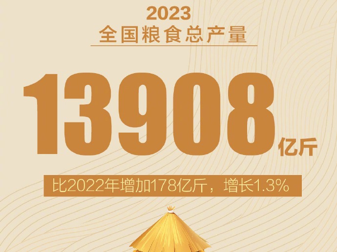 国家统计局11日发布数据显示,2023年,全国粮食总产量13908.2亿斤,比上年增加177.6亿斤,再创历史新高,连续9年稳定在1.3万亿斤以上。详情>>