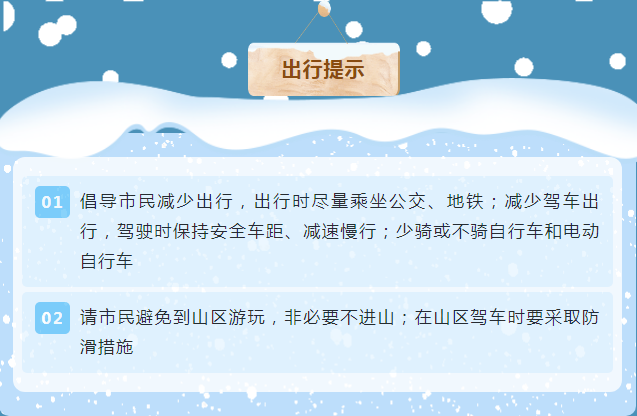 降雪时受道路通行条件影响,行车速度慢且容易发生交通事故。高速公路和普通公路部分路段可能采取封闭措施。