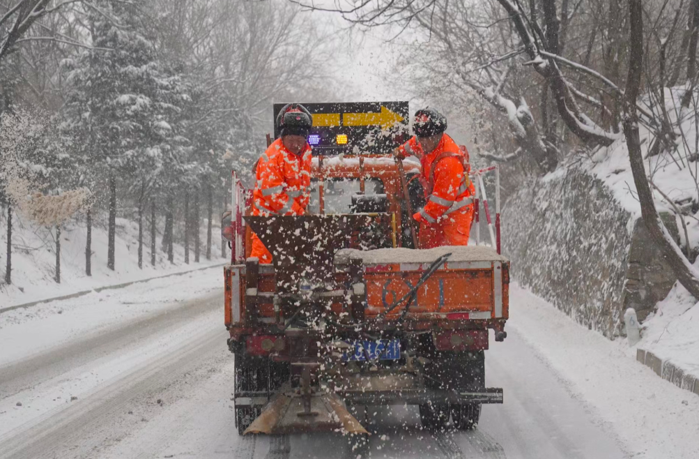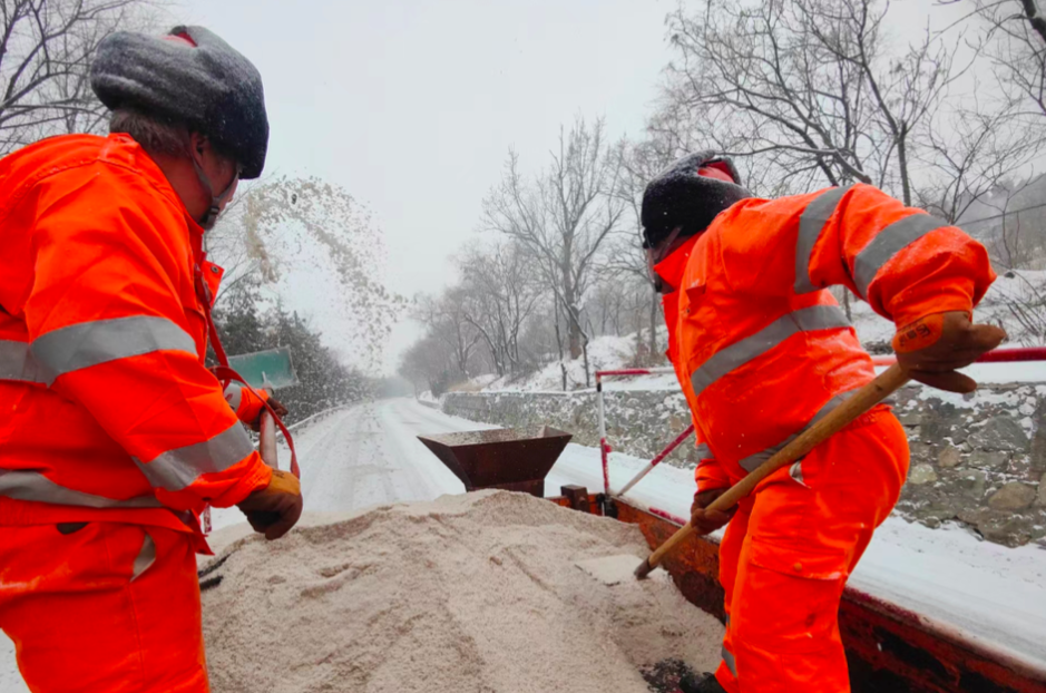 12月13日上午,门头沟公路分局养护作业人员在三温路布撒融雪剂,保障雪中道路畅通。