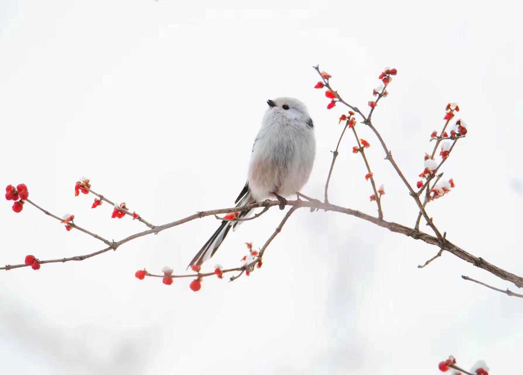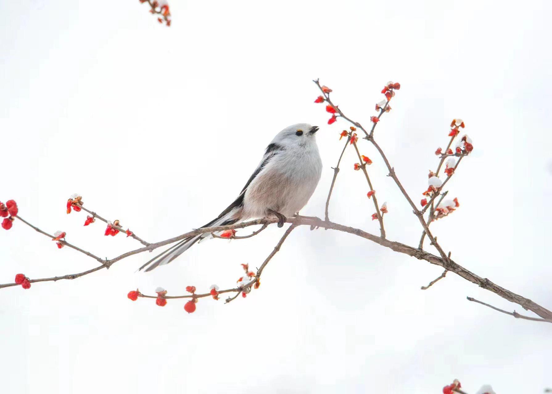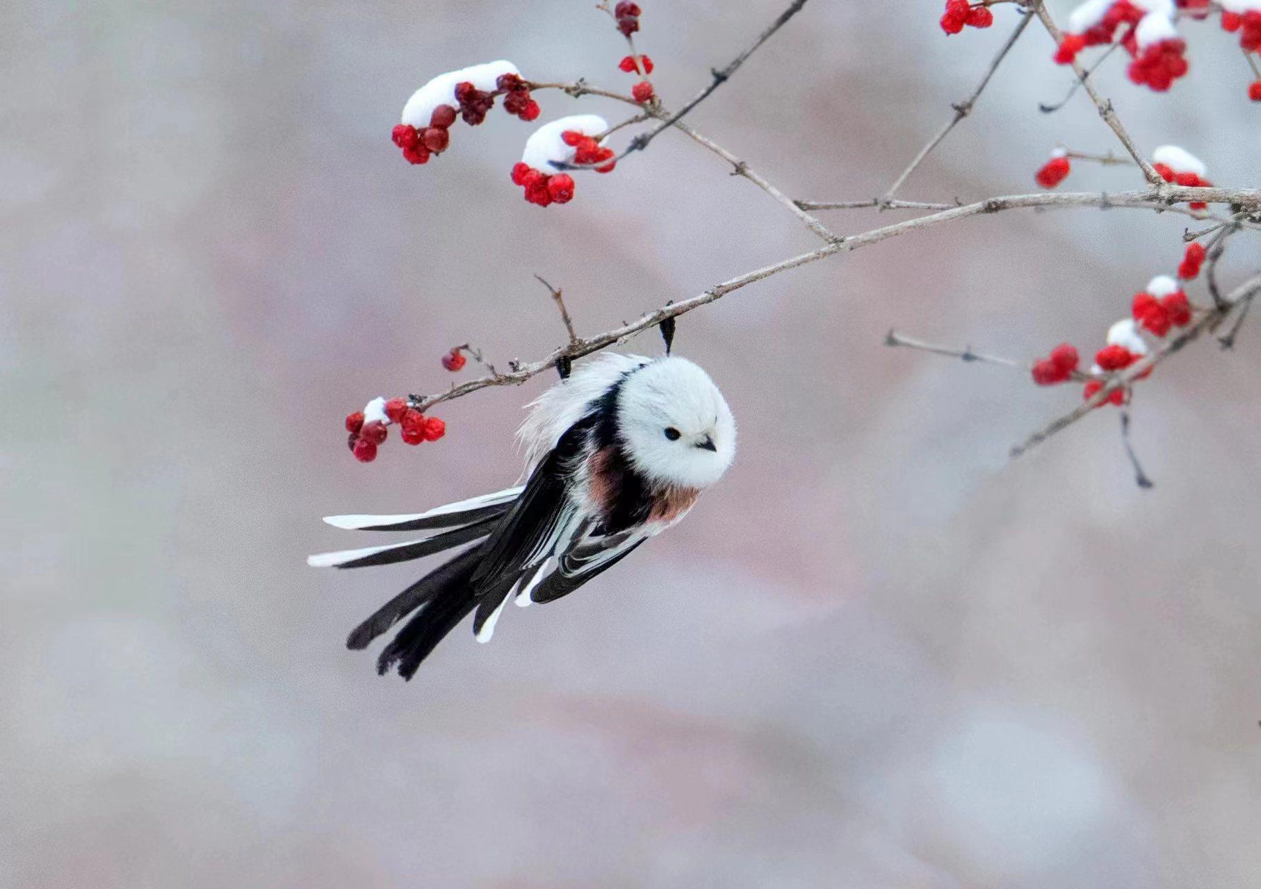近日,北长尾山雀现身北京。一片银装素裹下,毛茸茸的小山雀时而引吭高歌,时而展翅飞翔,活泼可爱。它们常倒挂在树枝上取食,片刻便飞至下一棵树上,通常不做长距离飞行。
