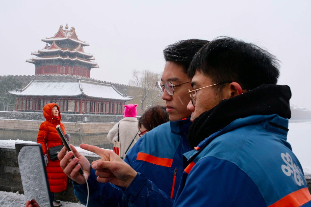 大雪纷飞里的故宫如诗如画,红墙绿瓦在白雪的衬托下更显庄重典雅,游客们穿着保暖的棉衣在雪地里肆意玩耍,拿起手机拍下一幕幕雪景。“为了能让游客更好地直播分享雪景,我们这几天在各大景区都做了网络优化工作。”北京联通网优中心工作人员于典和同事冒雪穿梭在故宫里,不一会儿就“白了头”。