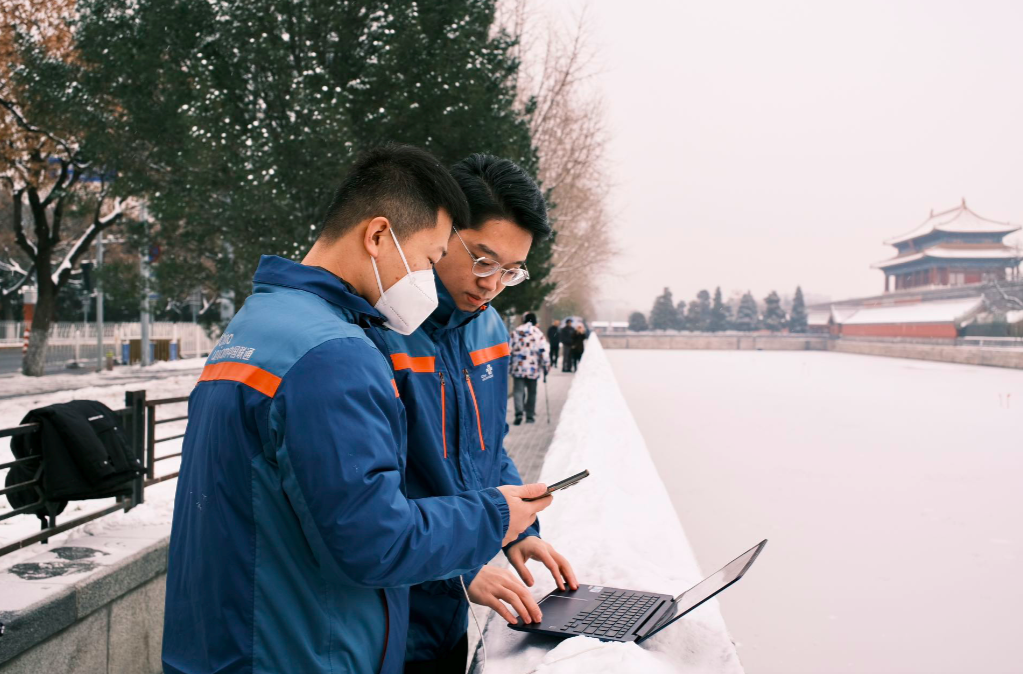 “看看这儿上传速率怎么样,这儿游客多。”于典捧着电脑站在雪中,眼睛紧盯着屏幕,鼻子被冻得通红。看到上传速率符合标准时,他又和同事快速赶往下一个点位进行测试。