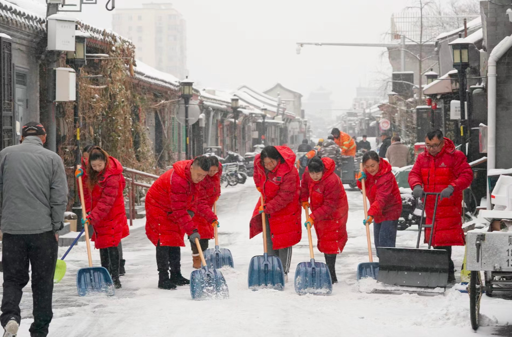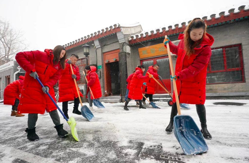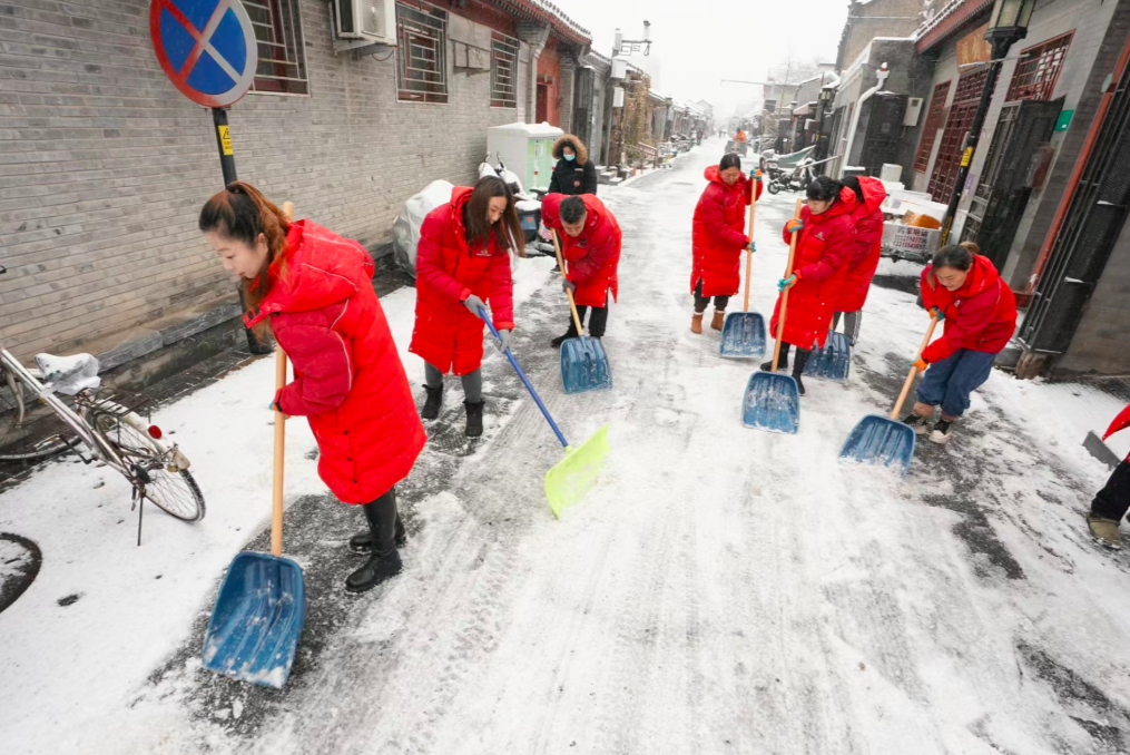 12月14日,前门大栅栏街道西河沿社区的社区工作者们冒雪对辖区街巷路面进行扫雪铲冰作业,确保居民出行安全。