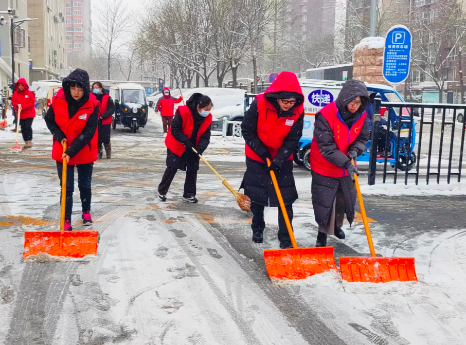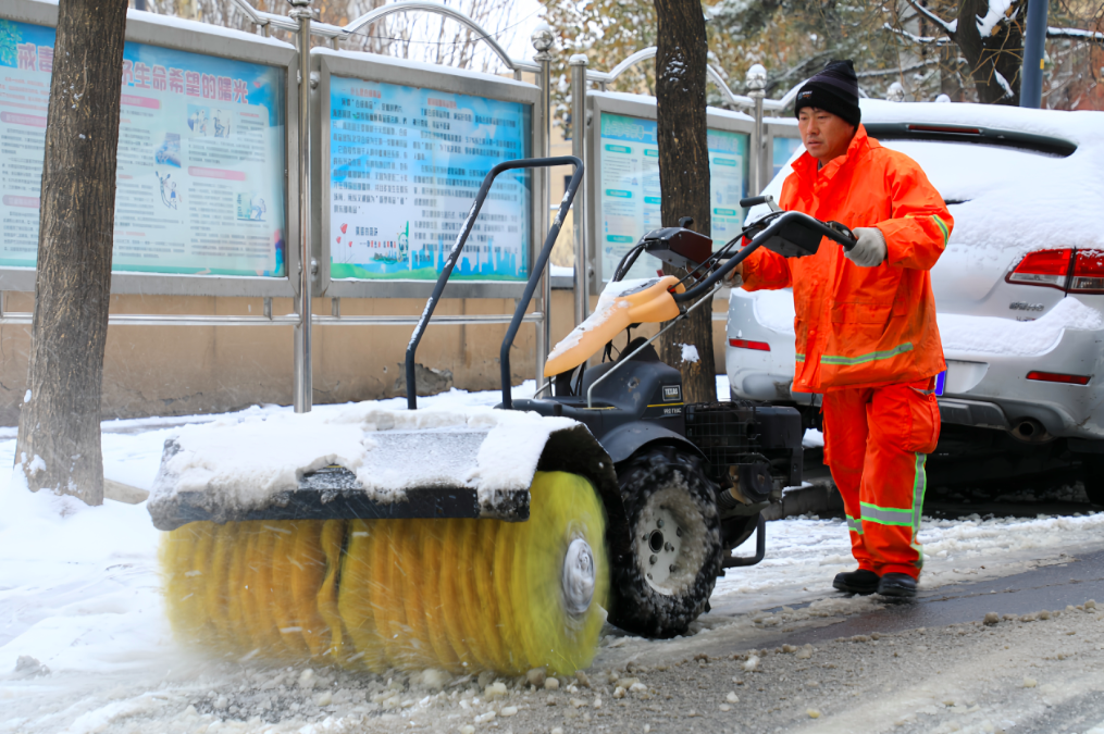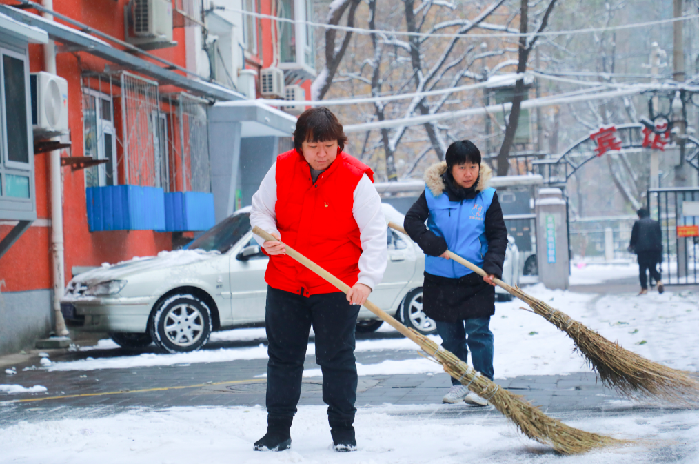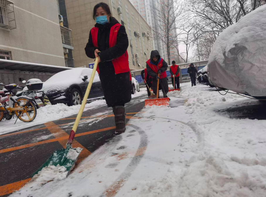 石景山区金顶街街道金五区社区工作者,清扫社区道路内积雪,保障居民安全出行。