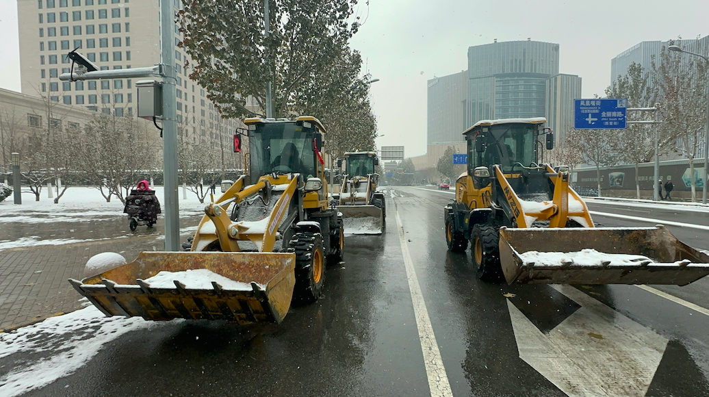 撒下融雪剂后,路面上的积雪化成了浮冰和雪渣。雪辊扫路车上场,将雪渣都吹扫到路边。铲车紧随其后,将路边成堆的积雪清运出去。为了应对这场降雪,作业人员一夜无眠。