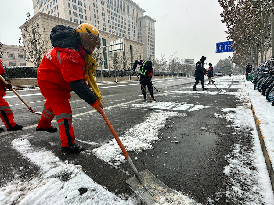 早上6时,早高峰还未到来,环卫人员、巡控员、勤务人员已经上岗,他们拿着铁锹、雪铲和扫帚,分头对人行步道、楼宇门前、背街小巷等区域进行除雪。