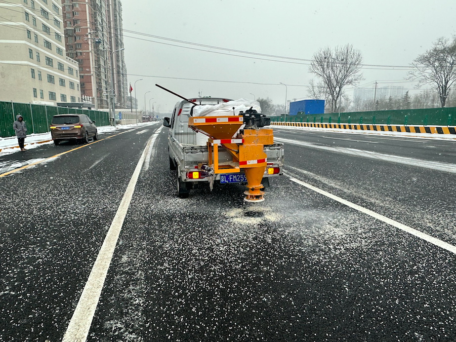 从昨天起,两台撒布机不间断地在沿着道路抛撒融雪剂,每走一趟3条车道上都均匀地覆盖了一层融雪剂。“撒布机比人工效率高,一次可以装载一吨重的融雪剂。6个小时就能将核心区30万平方米的道路上都撒完一遍。”作业人员说。
