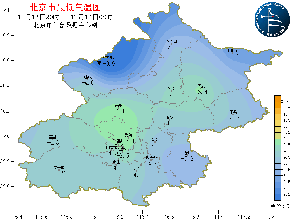 根据最新的气象资料分析,预计15日至16日我市将出现大风和寒潮天气,有3、4级偏北风,阵风7级左右;气温大幅下降,16日白天最高气温降至-7℃左右,夜间最低气温降至-16℃左右。北京市气象台12日16时30分提前发布了寒潮蓝色预警信号,请注意防风防寒。