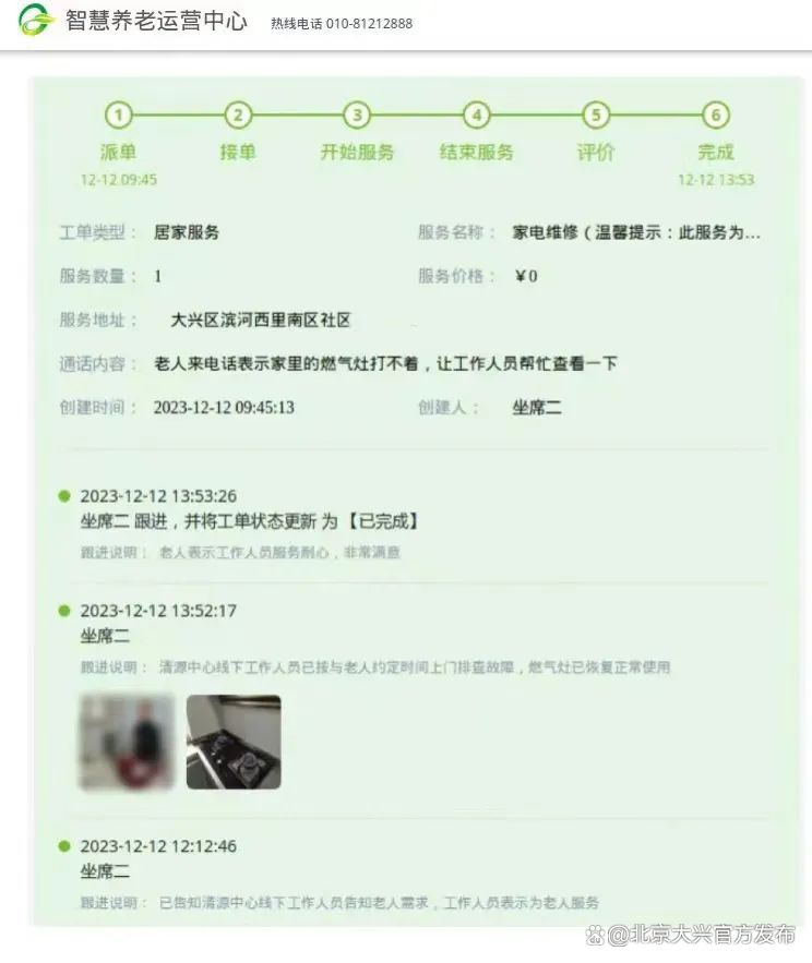 为加大基本养老服务对象关爱力度,街道养老指挥中心组织辖区7个养老服务驿站巡视员集中上门探访,坚持24小时值班值守工作机制,畅通智慧养老服务平台咨询热线。接到滨河西里南区社区失独老人的求助工单时,工作人员立即上门为老人解决燃气灶故障问题,确保老人求助有门、受助及时。自12月11日至今,养老指挥中心已拨出关怀慰藉电话490次。