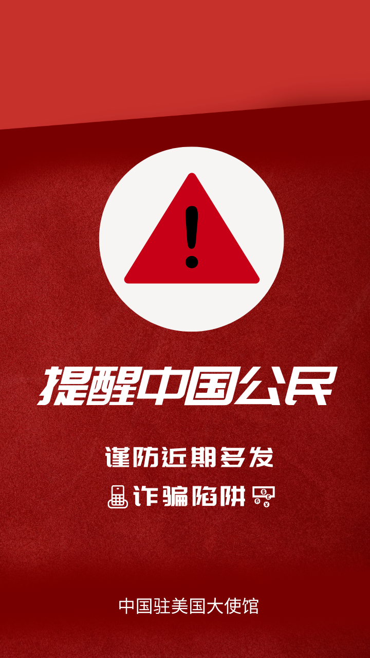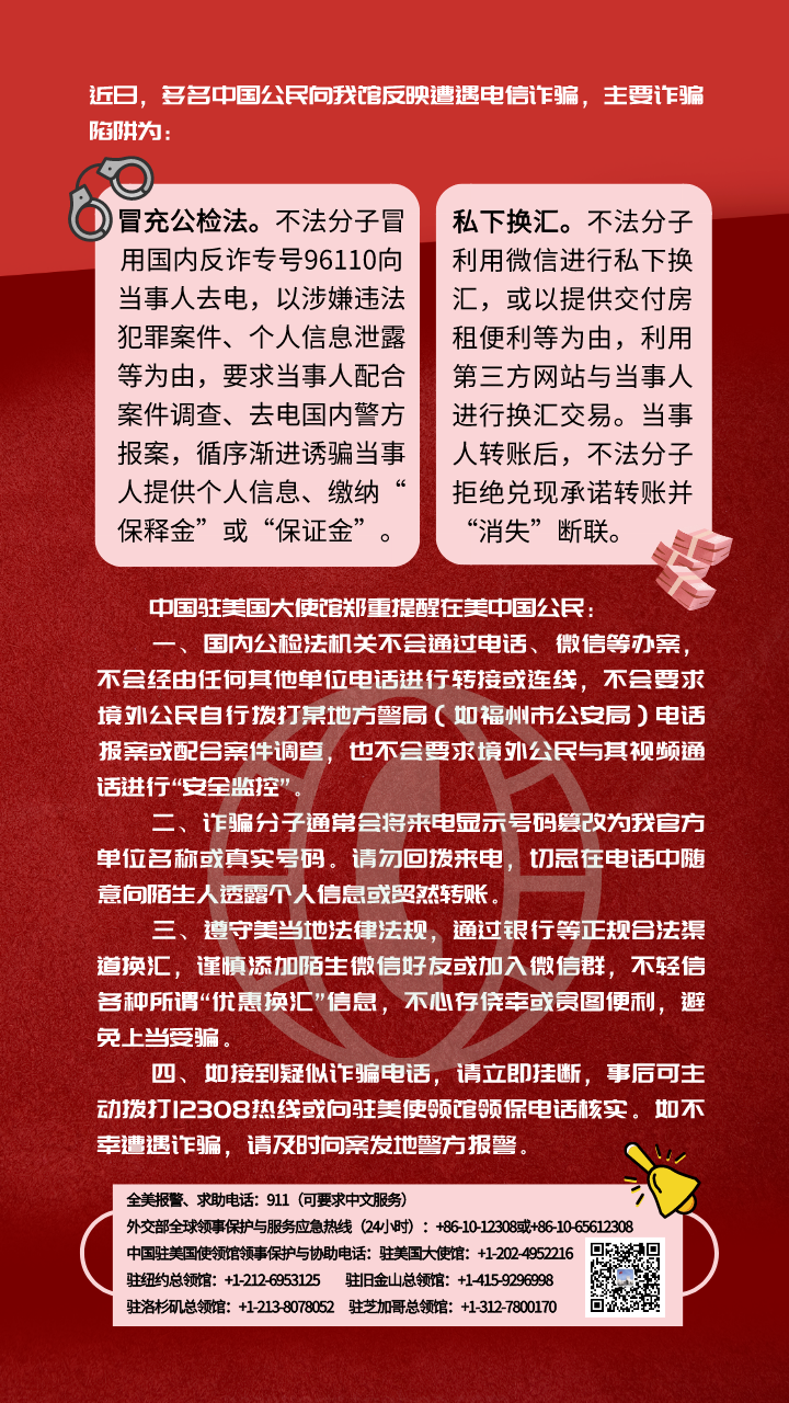 近日多名中国公民向驻美大使馆反映遭遇电诈,我使馆提醒