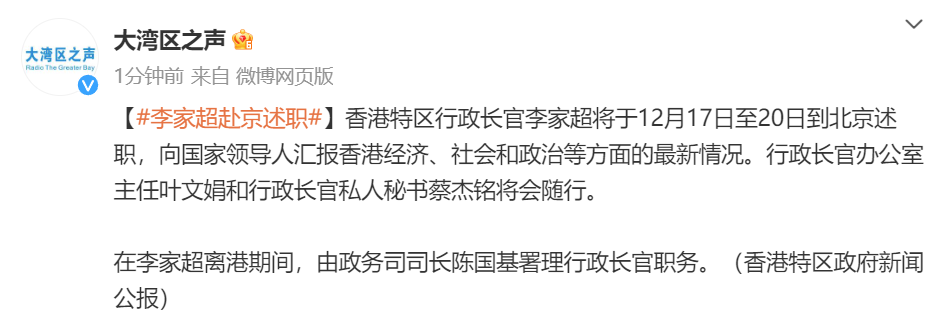 @大湾区之声 消息,香港特区行政长官李家超将于12月17日至20日到北京述职,向国家领导人汇报香港经济、社会和政治等方面的最新情况。行政长官办公室主任叶文娟和行政长官私人秘书蔡杰铭将会随行。