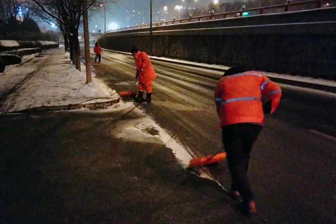区城市管理委组织清扫保洁队伍以城区道路、学校、医院、商圈、主要交通路口区域为重点,聚焦主辅路面、人行步道、背街小巷,于13日20时预撒融雪剂,根据夜间降雪和道路积雪情况及时增加施撒频次。14日4时,作业人员、车辆在分工片区按照“主辅路见底色、步道亮出80厘米路面”的标准,开展除雪作业,并在雪中随时清扫,确保早高峰通行顺畅。