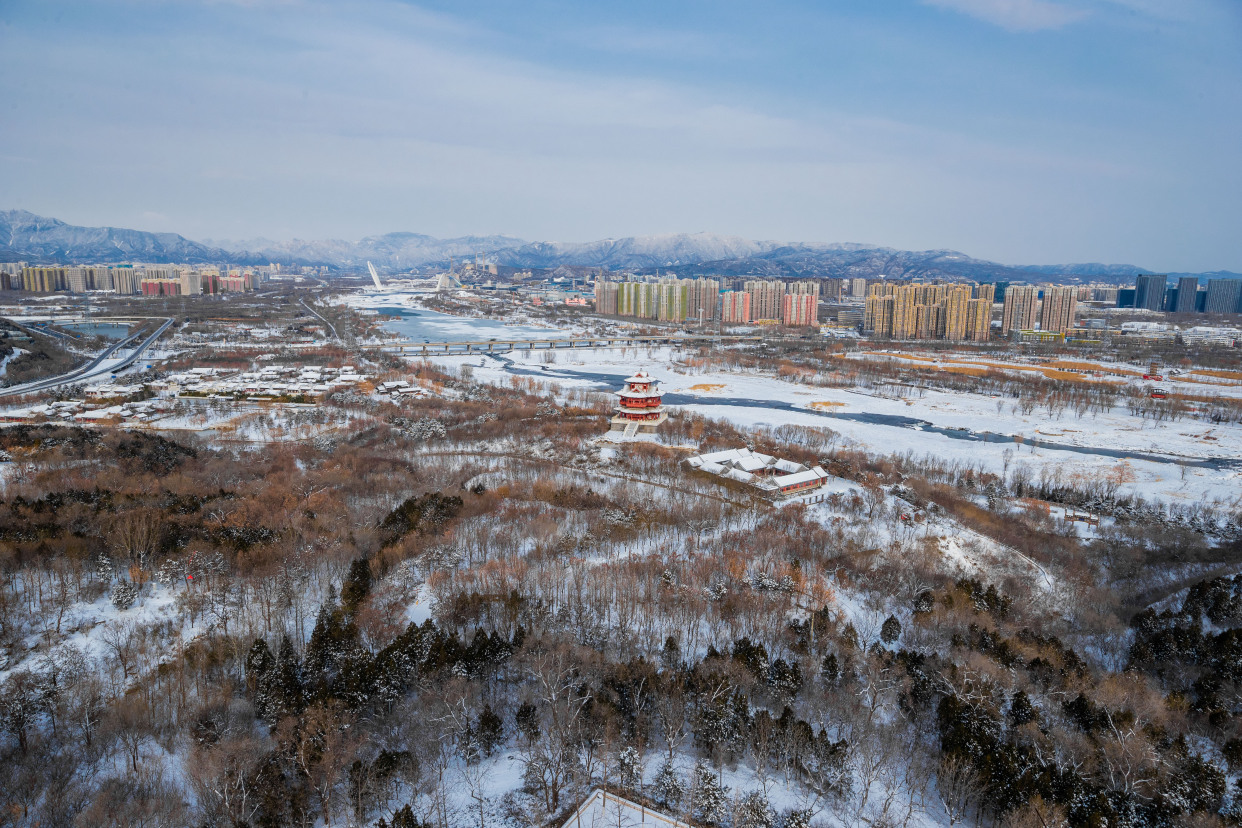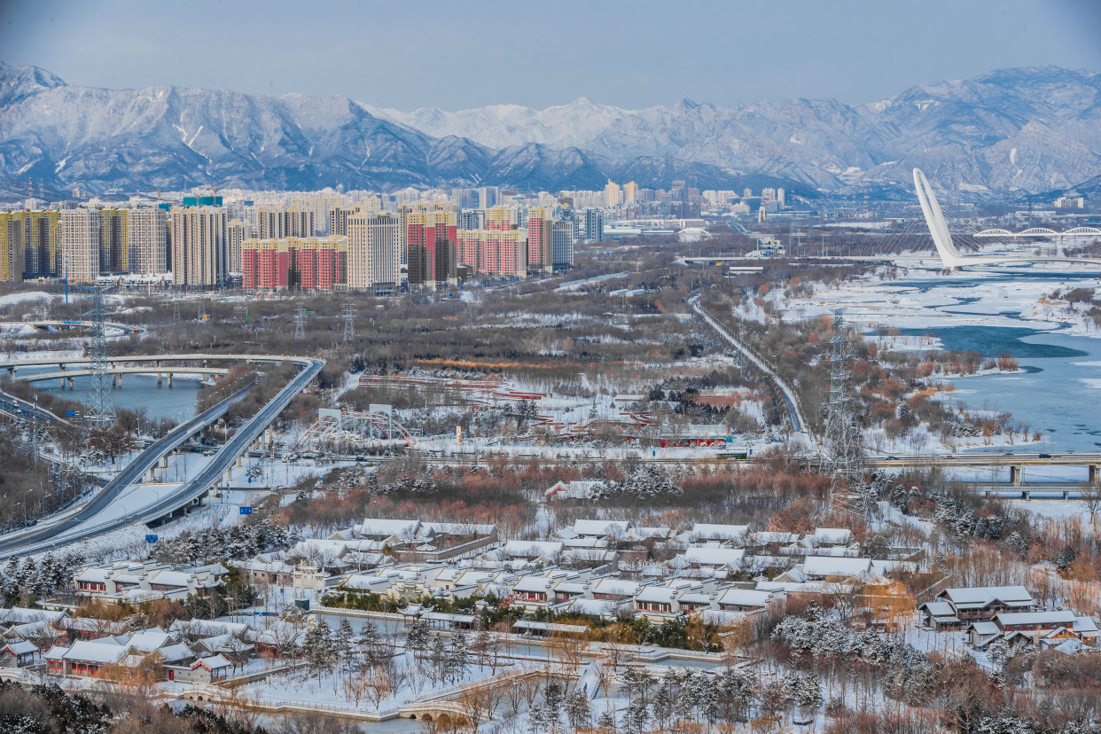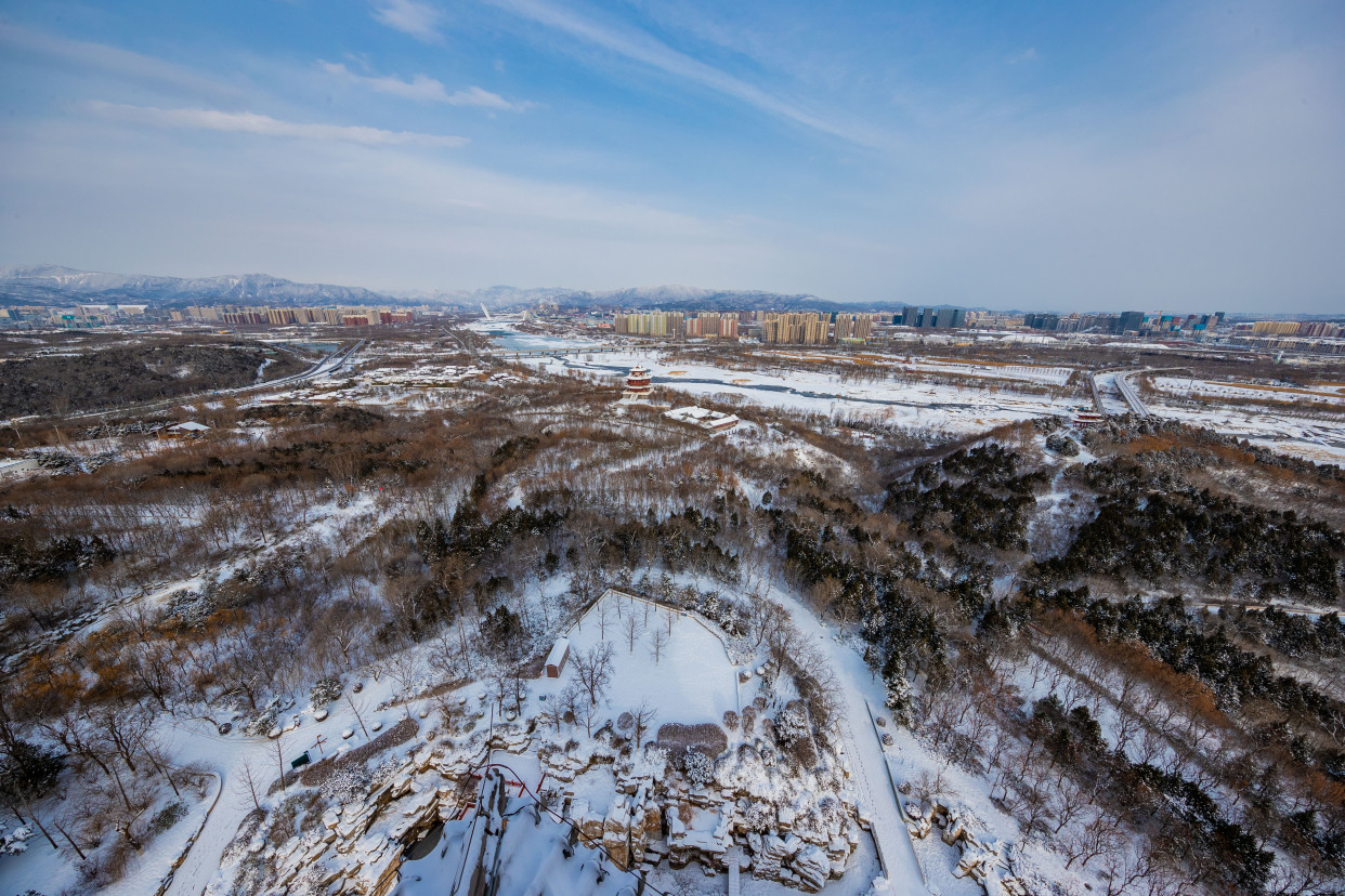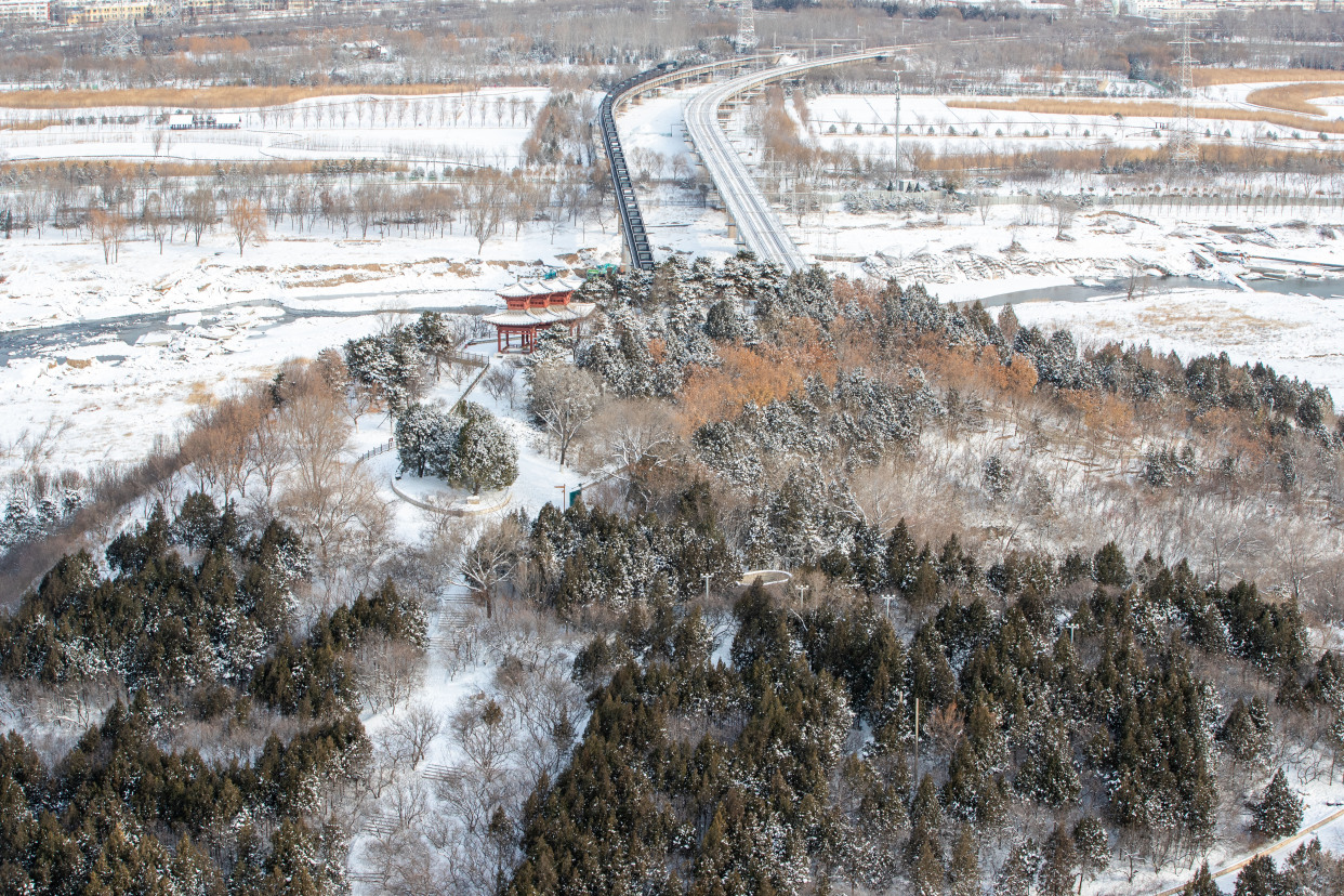 12月15日,记者来到北京园博园,整个园区被白雪覆盖,在白雪的映衬下,古建更添韵味。记者来到制高点俯瞰园博园,仿佛走入山水画之中,与夏季繁花相比,冬季的青黛色更加有深沉味道,远处燕京八景之一的西山晴雪展现在眼前。永定河在白雪的映衬下显出婀娜的曲线,惹得树上的松鼠也弯腰媲美。