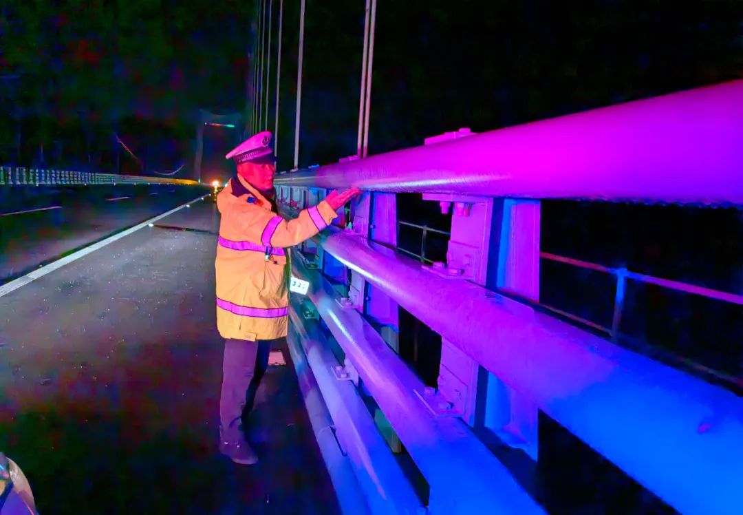 12月16日,贵州省贵阳市气象部门密切监视天气变化,持续做好气象监测预报预警,面向交通运输等行业提供气象服务。图为高速交警在桥面查看结冰情况 摄影:石奎
