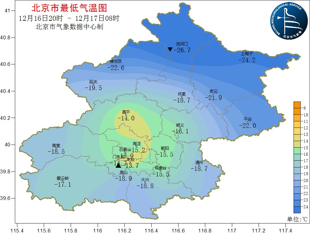 16日20时到17日08时,南郊观象台最低气温-15.5℃(17日07:48)