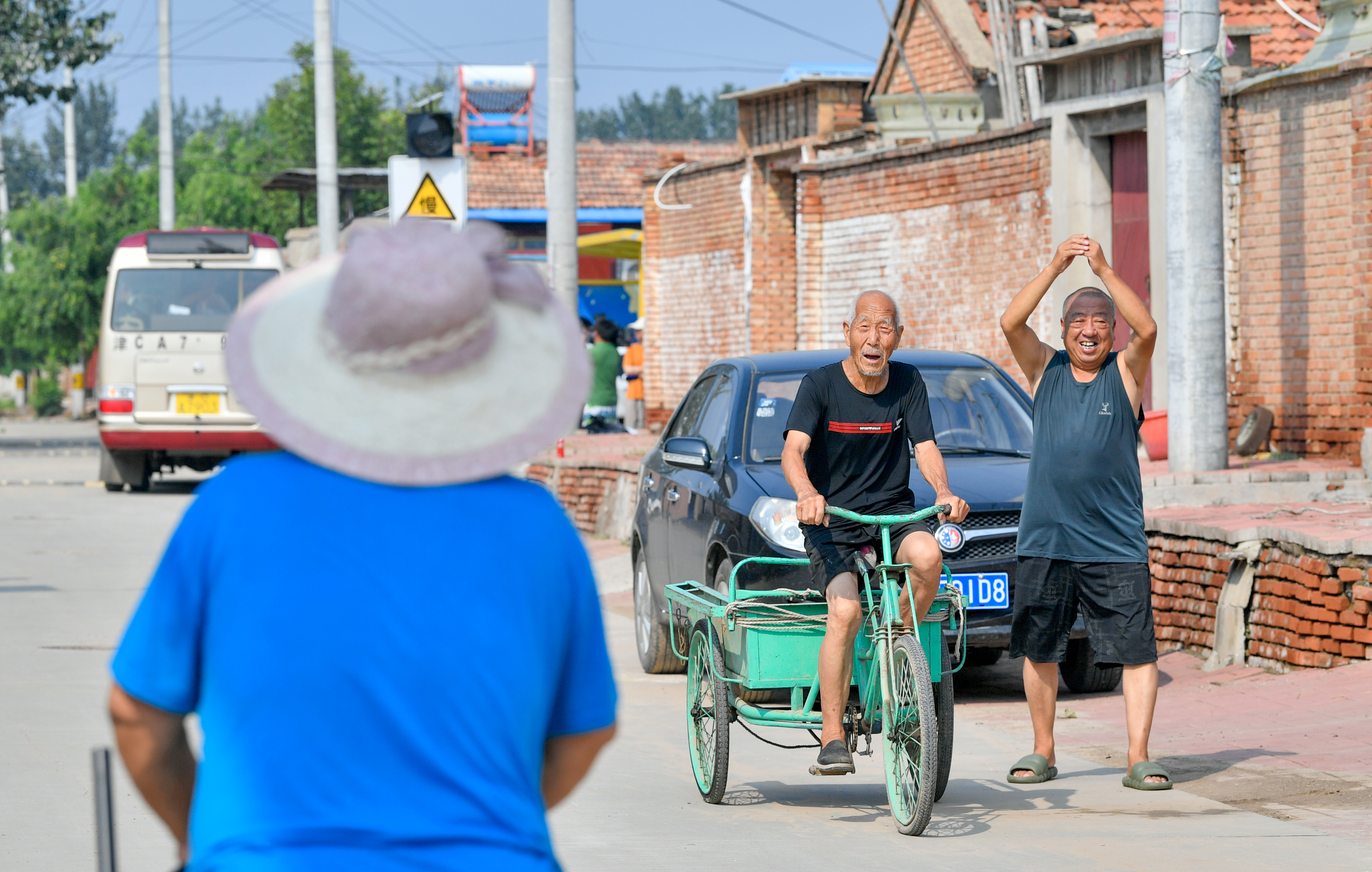 8月17日,在天津市武清区黄花店镇邵七堤村,返回家园的天津市永定河泛区转移安置村民相互问候打招呼。