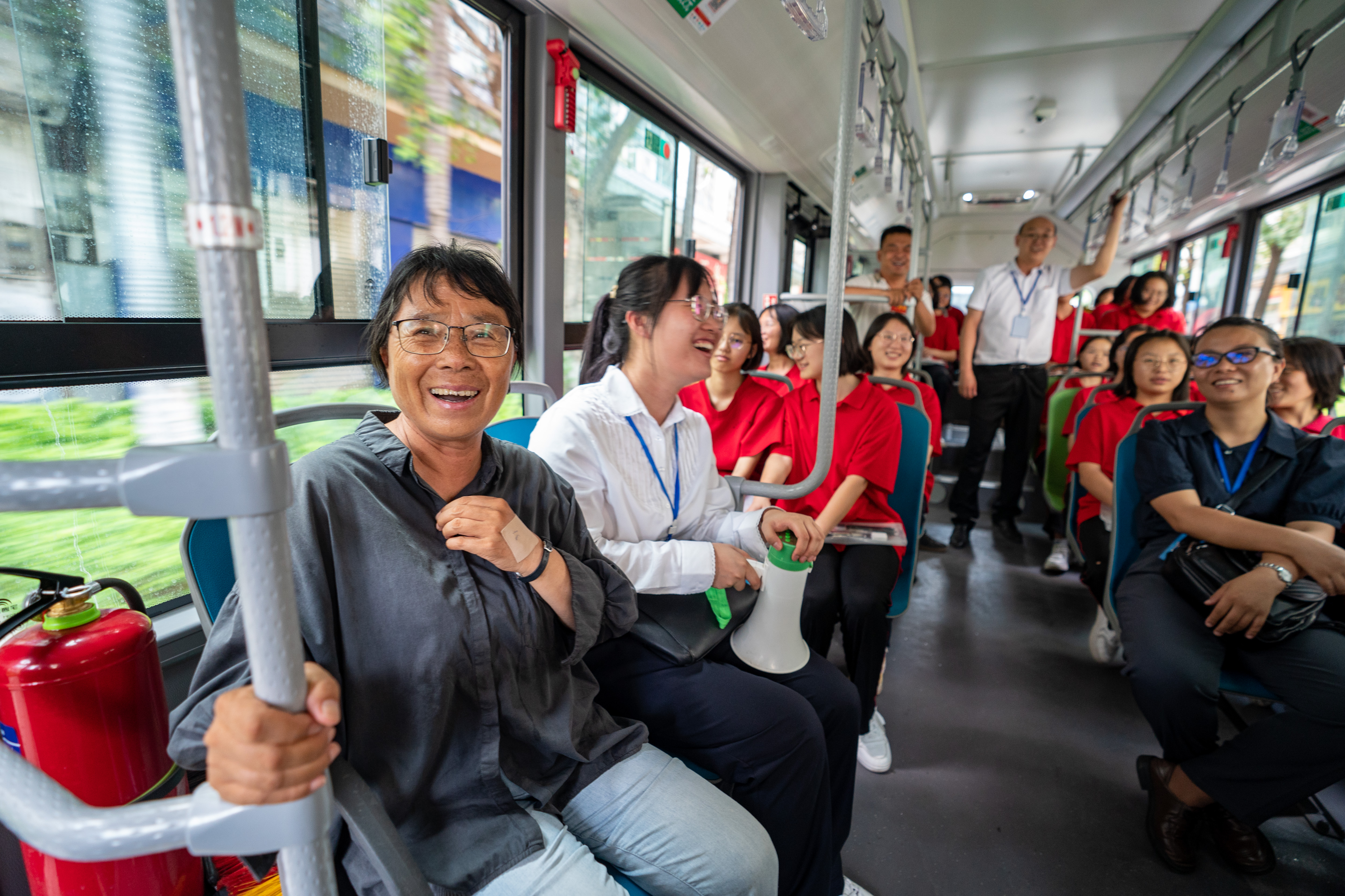 6月7日,高考首日的考试结束后,连续13年送考的云南丽江华坪女子高中校长张桂梅与学生在返回的车上一起唱歌。