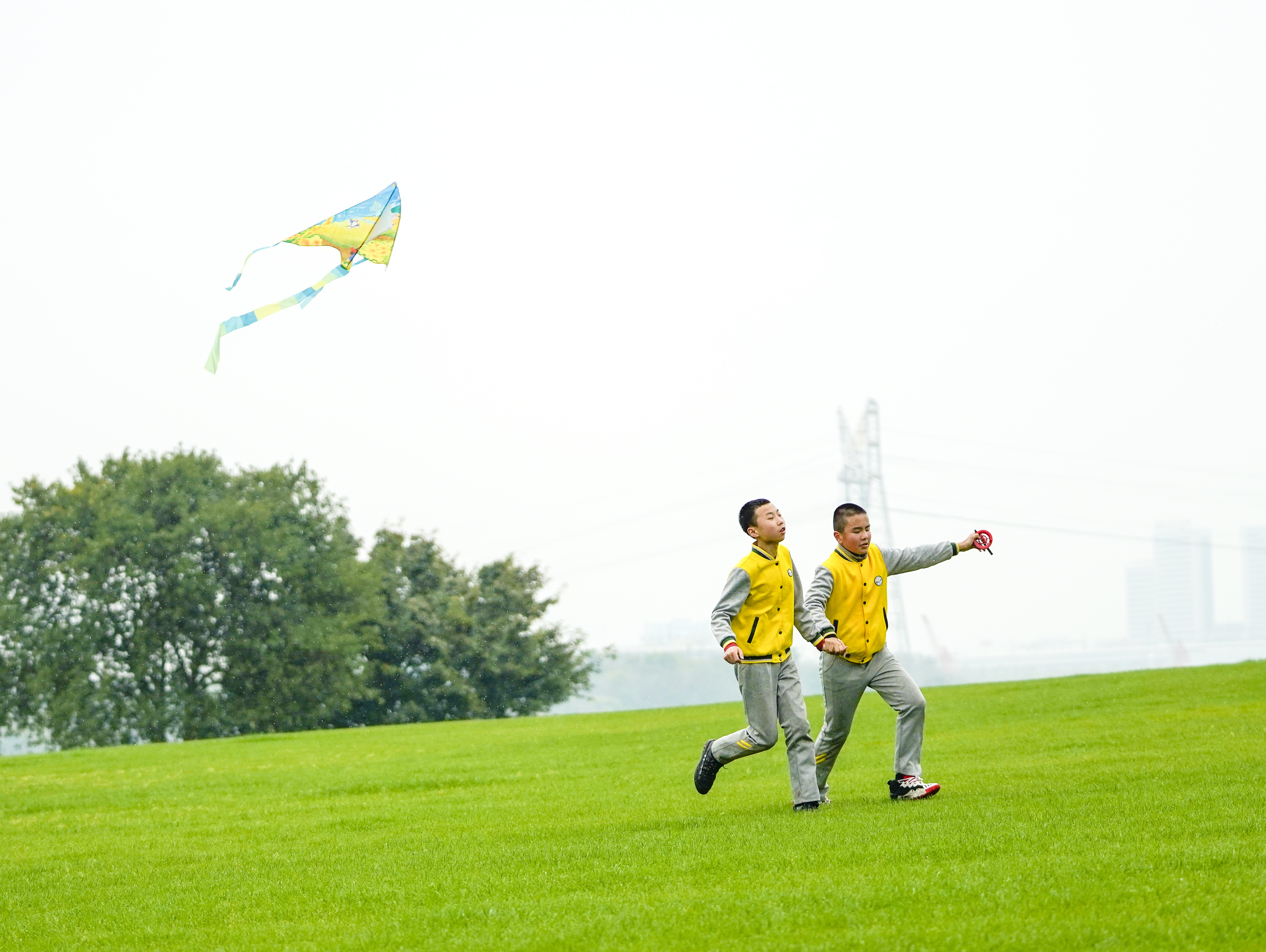 3月31日,在重庆市广阳岛的一片草地上,两名重庆市特殊教育中心视力障碍学生牵着手放风筝。