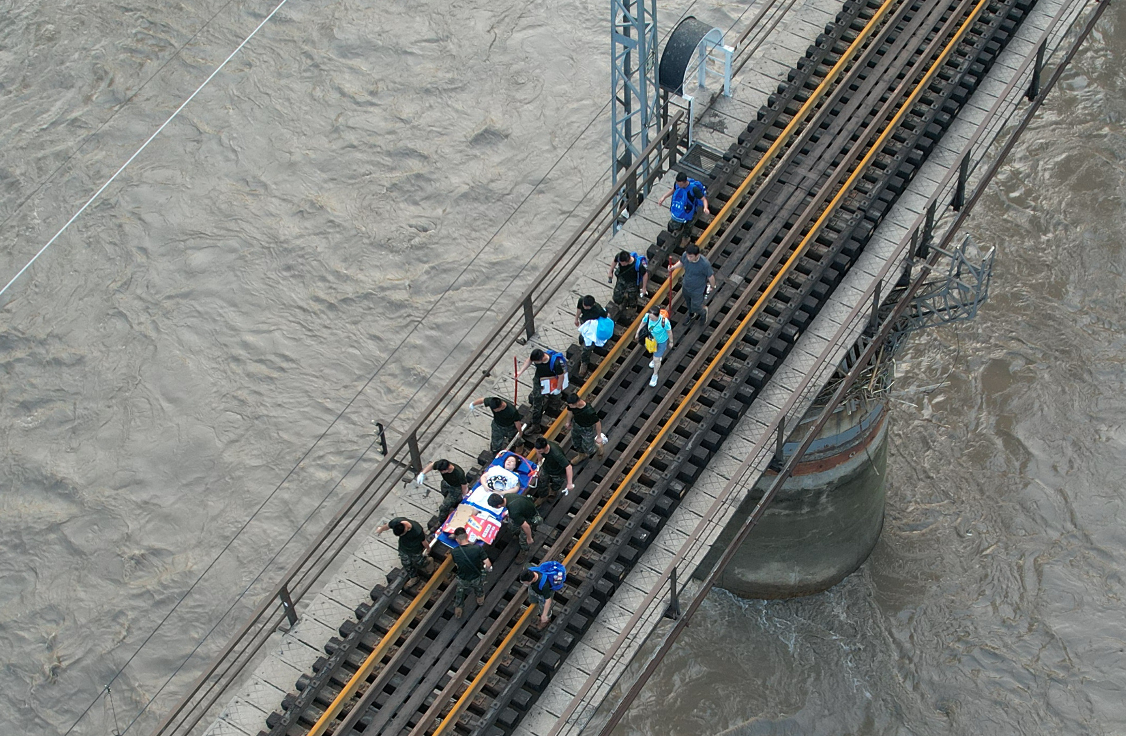 8月2日,由于持续强降雨而被困北京门头沟山区的列车旅客在救援人员帮助下徒步赶往转运客车(无人机照片)。