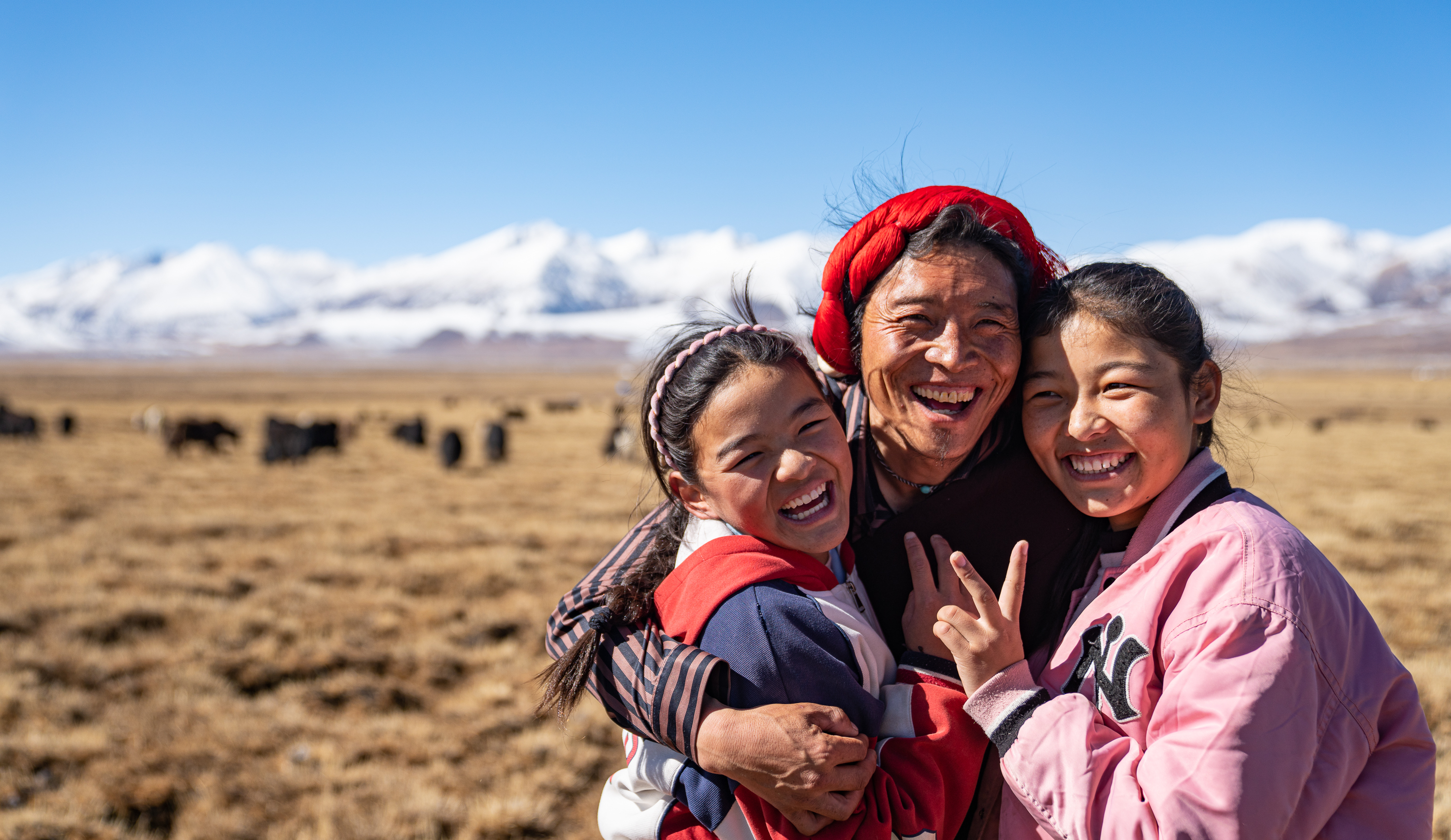 11月15日,在西藏当雄县龙仁乡曲登村,15岁的当雄县中学学生斯曲卓玛(右)和爸爸、妹妹在一起。