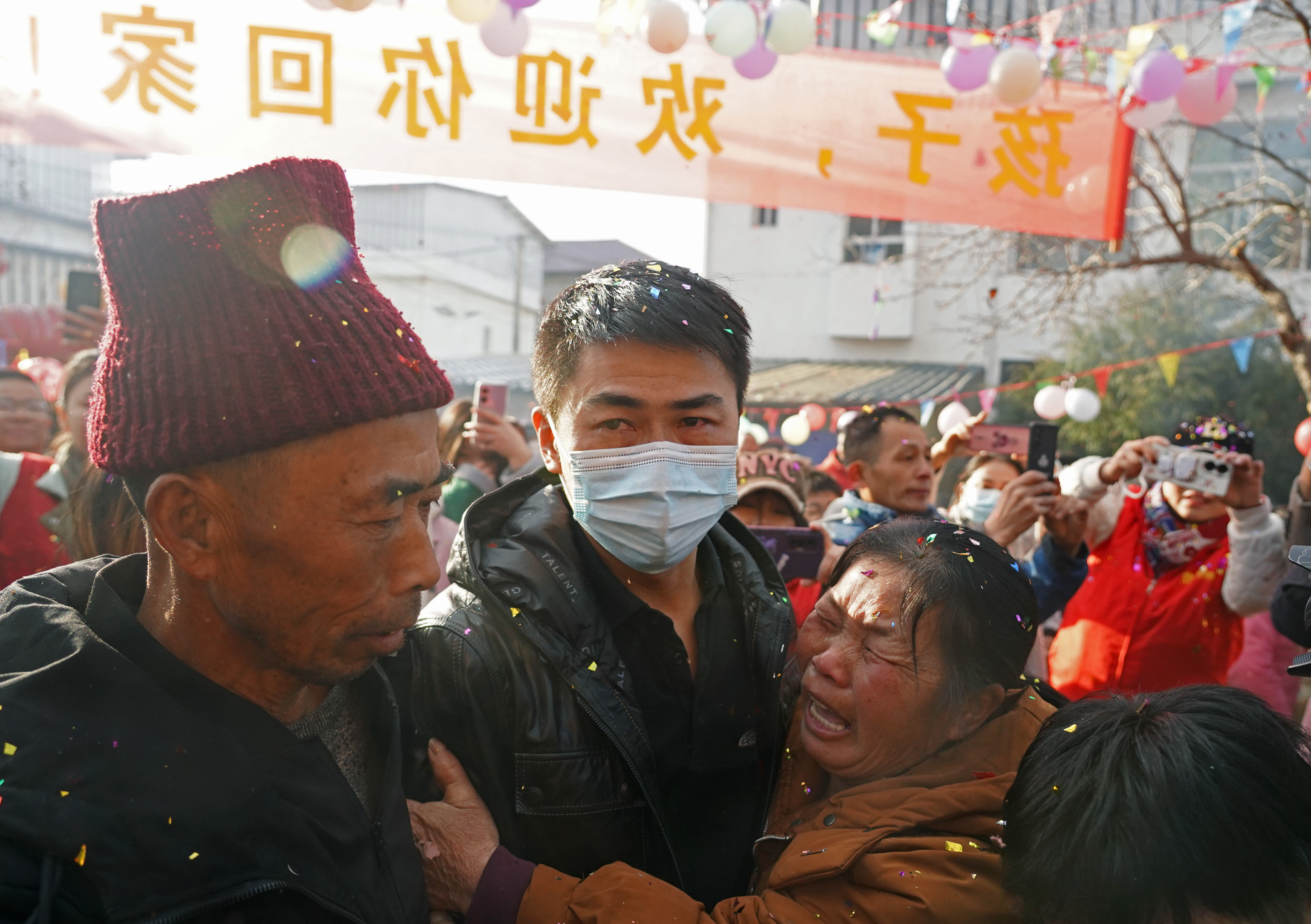 1月30日,在江西省靖安县黄龙村,母亲余陈妹与被拐失散32年的儿子钱芳勇相拥而泣。