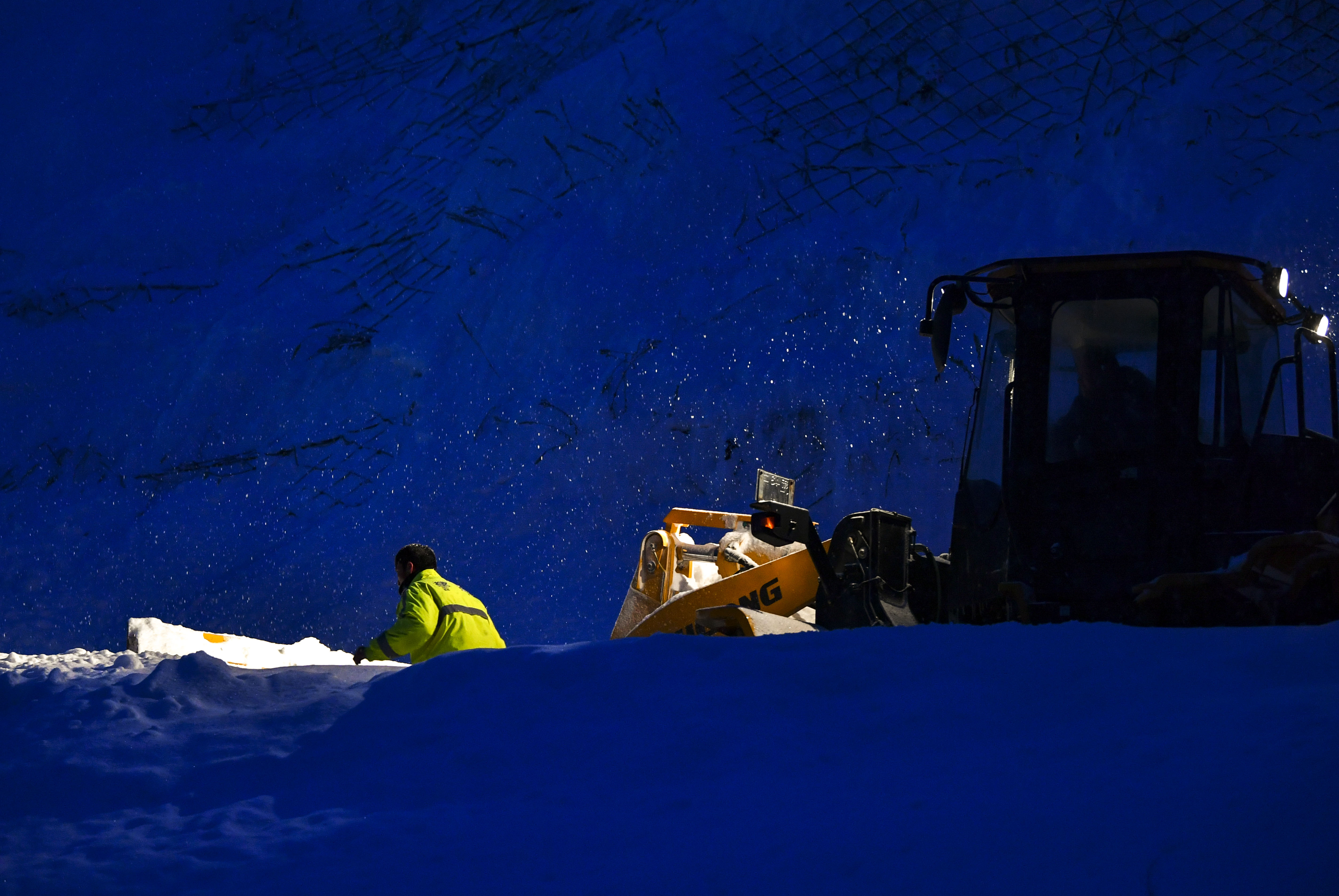 1月8日,新疆喀纳斯景区公安局交警大队辅警叶尔加那提·托合达尔在阿尔泰山深处的山间公路检查大雪中被困的车辆和人员情况。