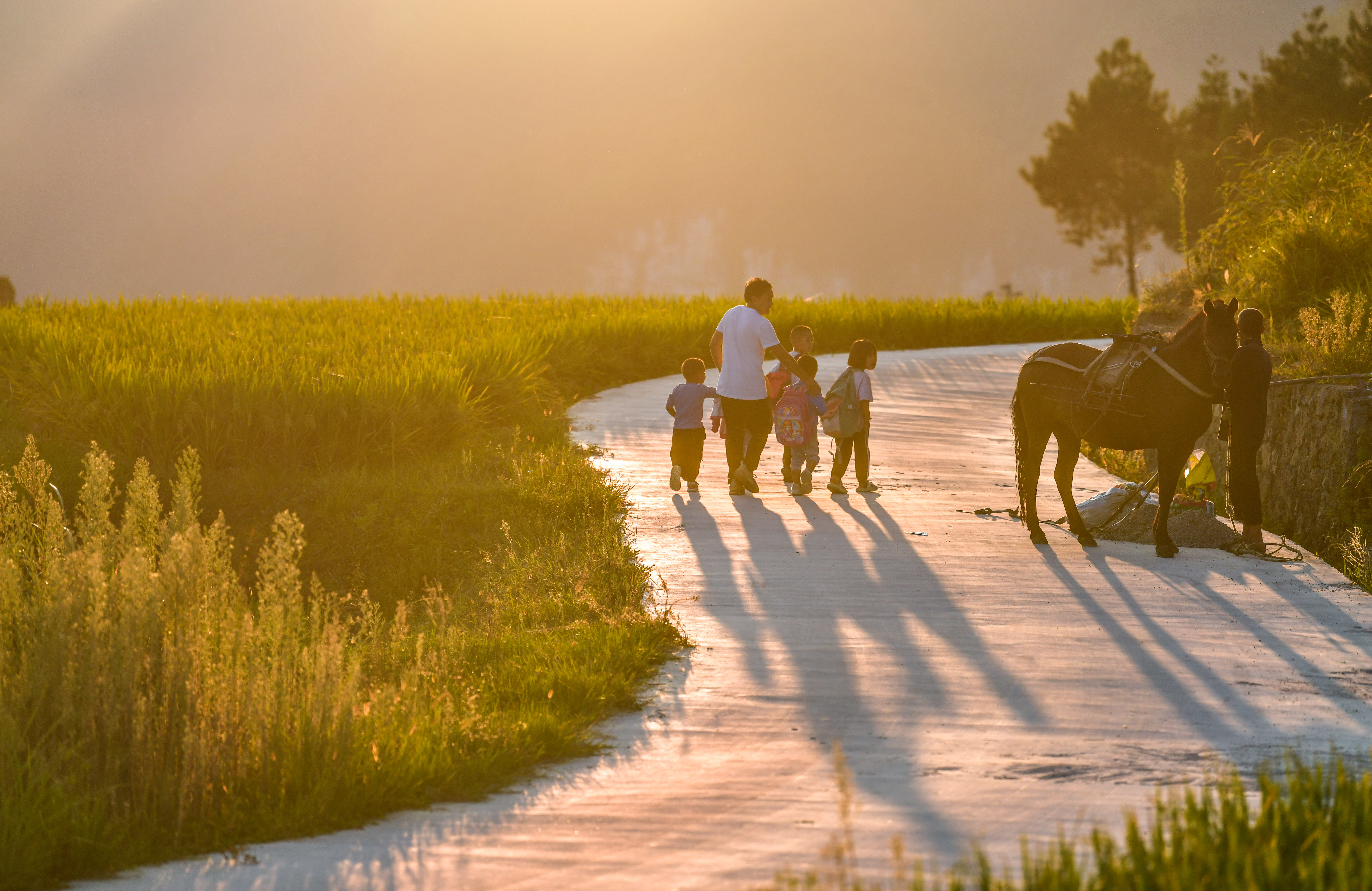 9月6日,贵州省黔南布依族苗族自治州贵定县沿山镇岩脚教学点教师陆成文护送学生放学回家。