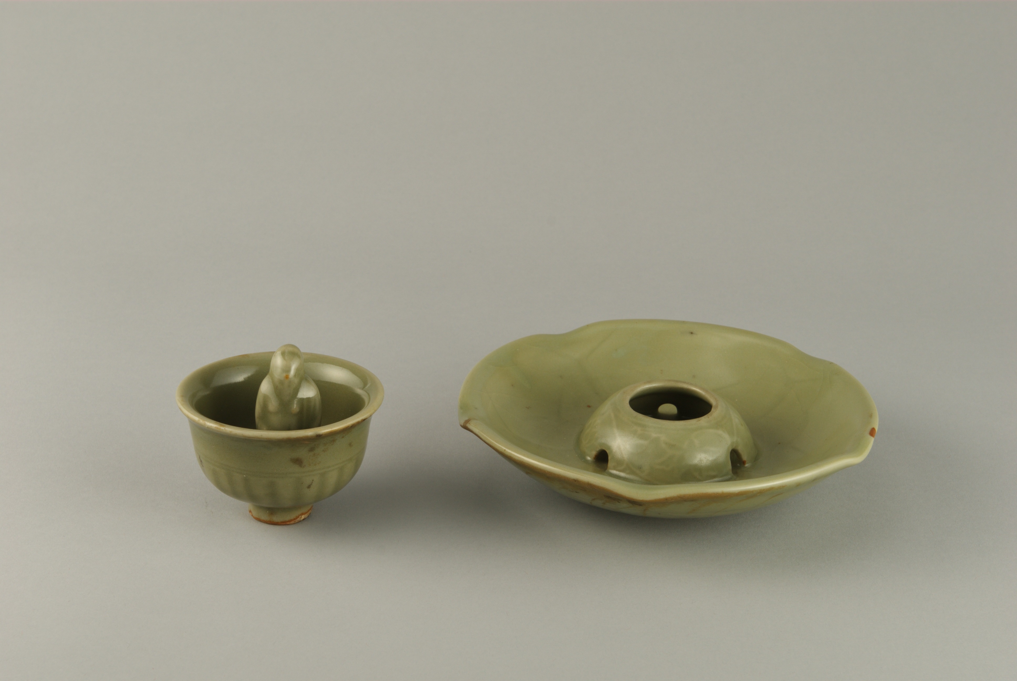 杯与杯托的外腹部均刻有划花菊瓣纹