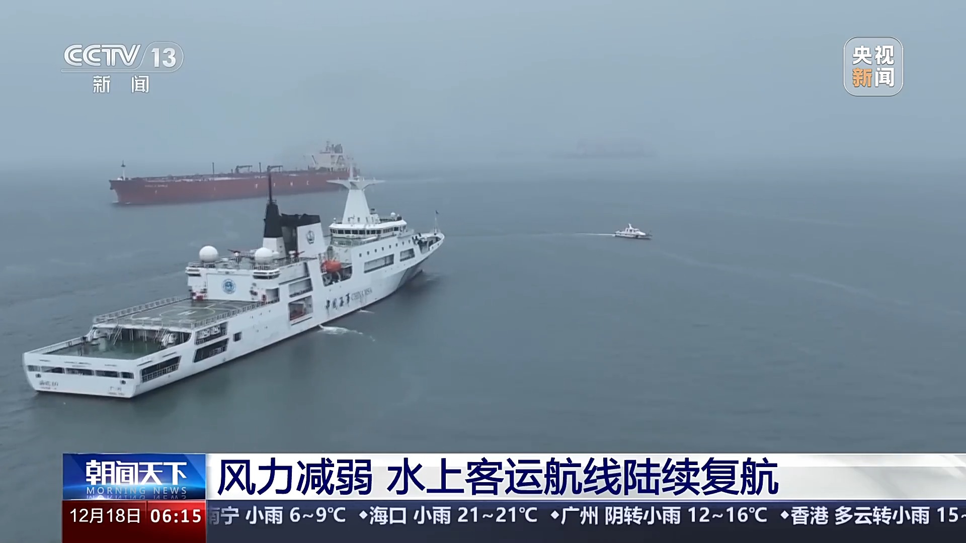 从12月17日12时起,根据海面风力情况,广东珠海市内往返海岛航线陆续复航,预计18日全部复航。江门川山群岛海上客运航线于12月17日下午陆续复航,汽车渡运预计于12月18日复航。