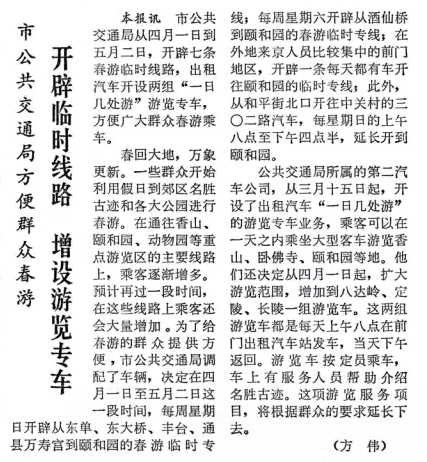 七十年代末,公交车的问题凸显。由于一些群众利用假日到郊区名胜古迹和各大公园进行春游。通往香山、颐和园、动物园等重点游览区的主要线路上,乘客逐渐增多。为了给春游的群众提供方便,市公共交通局调配了车辆,决定在四月一日至五月二日这一段时间,每周星期日开辟从东单、东大桥、丰台、通县万寿宫到颐和园的春游临时专线。