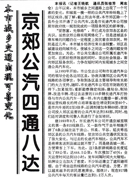 郊区线路也发展起来了。继1993年9月,市长途汽车公司开通京城至顺义的第一条915线路后,又一鼓作气于去年相继开辟了6条京城往返于房山、怀柔、平谷、延庆等远郊区县的公共汽车线路,使京郊公共交通状况发生了很大变化。