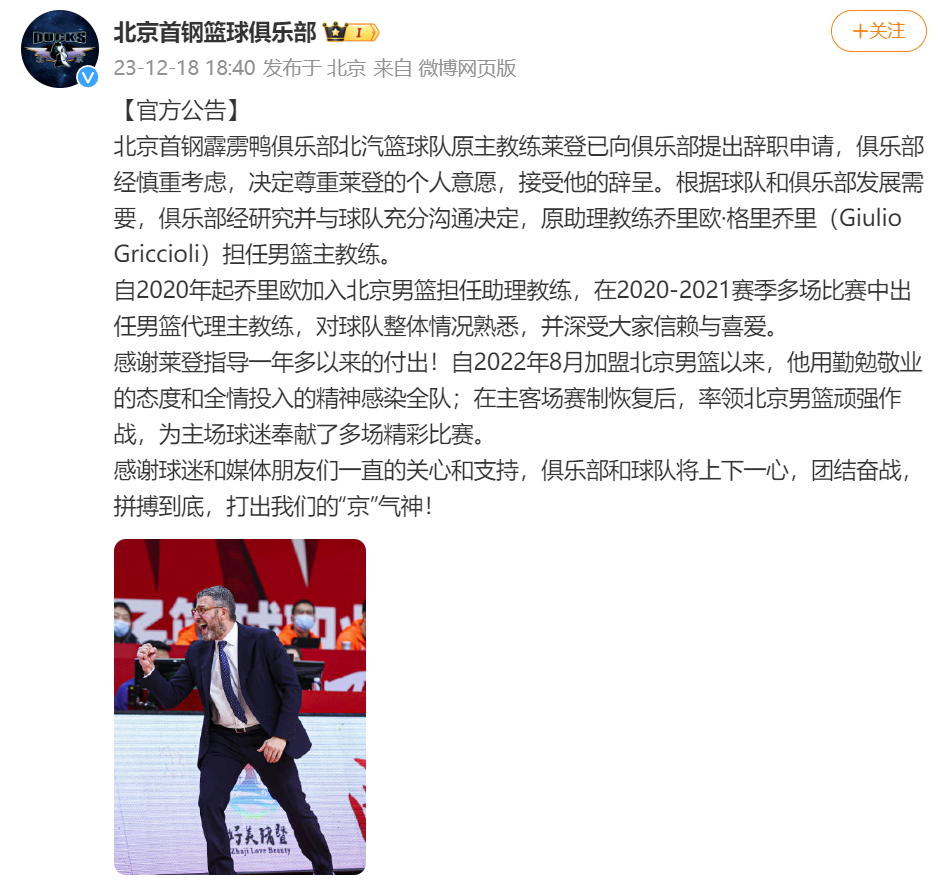 北京首钢篮球俱乐部微博发布公告,接受主教练莱登的辞职申请,全文如下: