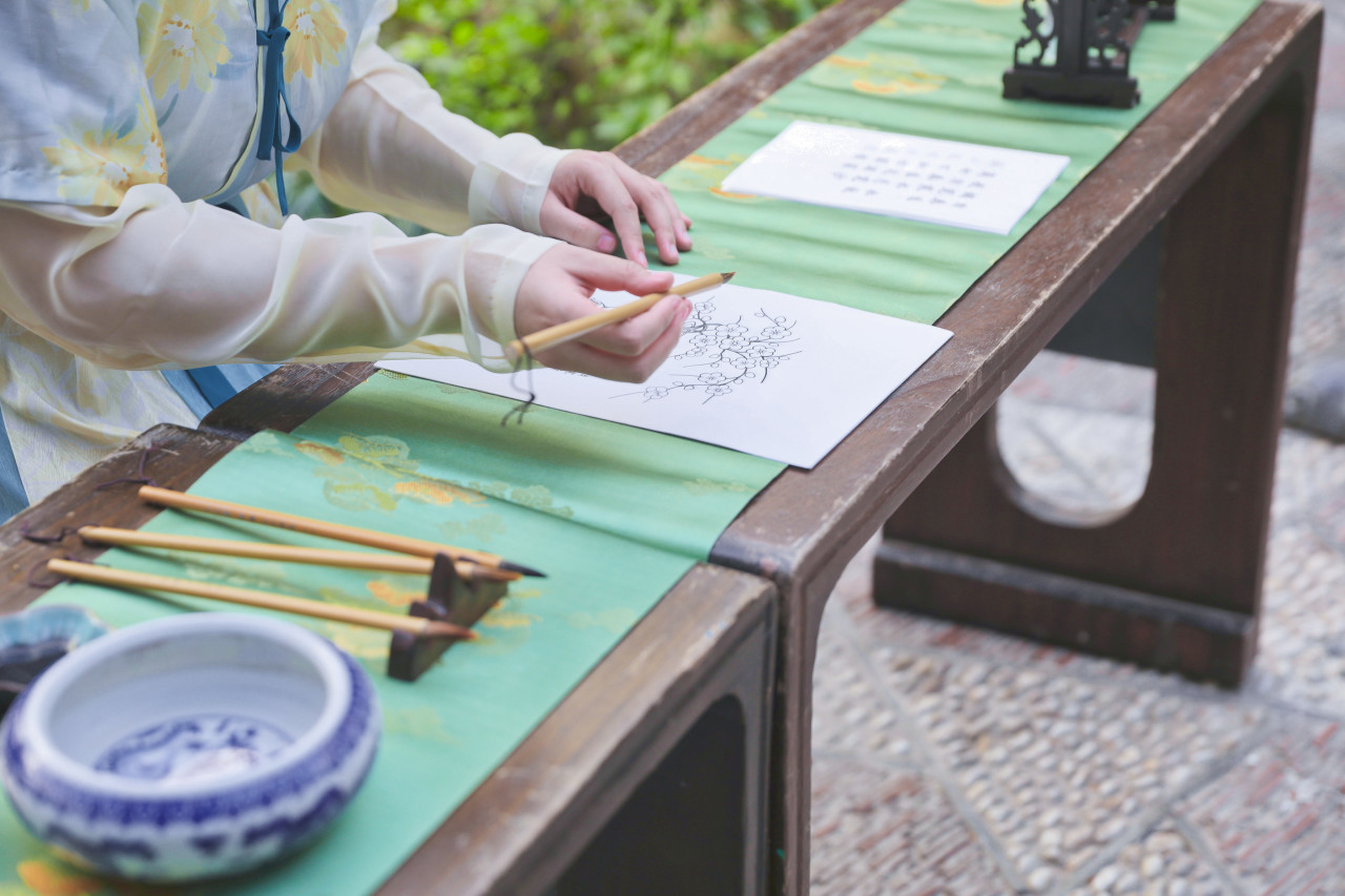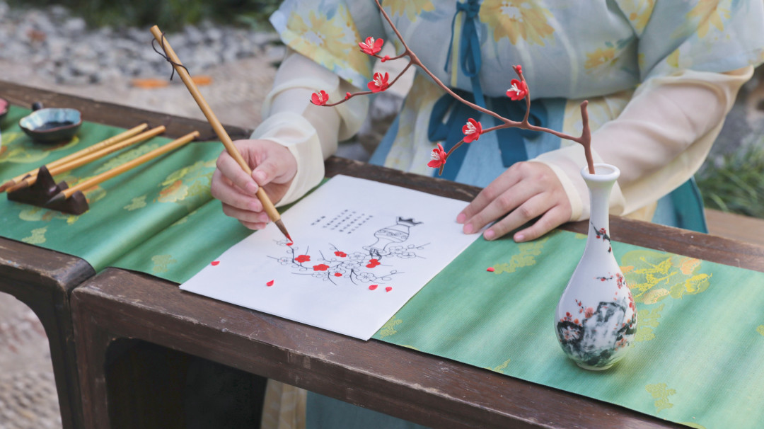 《帝京景物略》载:“冬至日,画素梅一枝,为瓣八十有一,日染一瓣,瓣尽而九九出,则春深矣,曰‘九九消寒图’”。手绘寒梅九九消寒图,以冬盼春,细数九九八十一天,静待春回。笔画描摹,点朱着墨,感受古人园居雅韵。