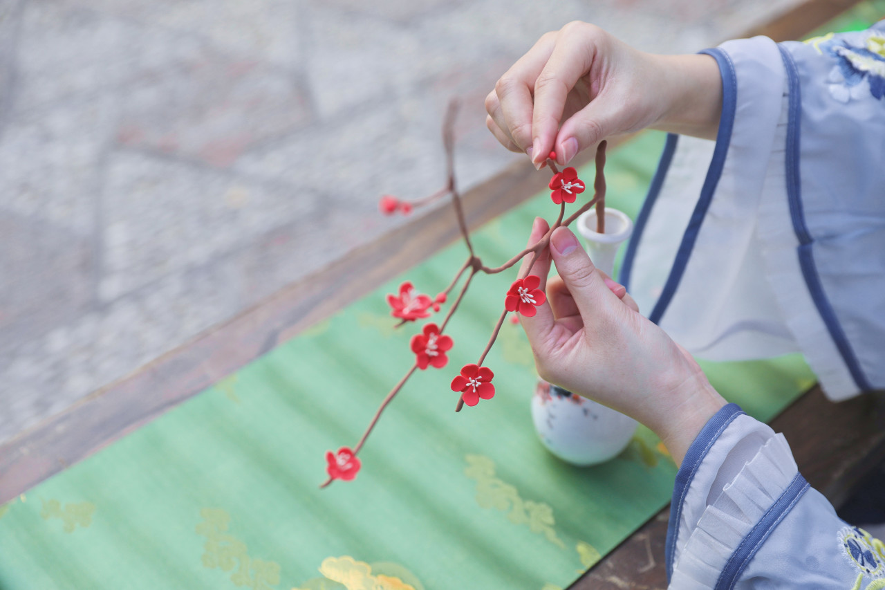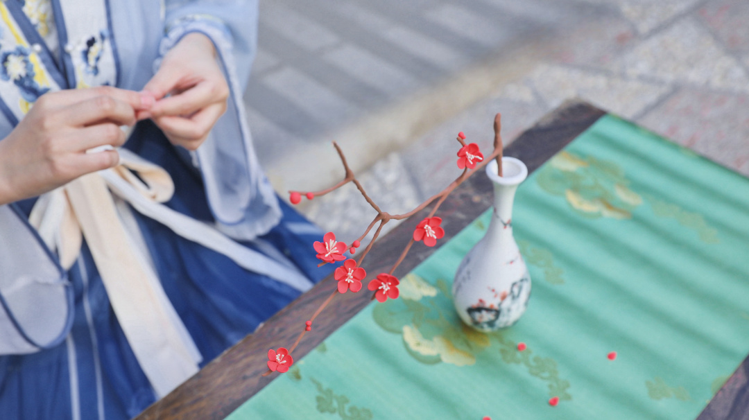 “疏影横斜水清浅,暗香浮动月黄昏。”梅花以雅致的姿态、独特的芳香触动人们的心境,更因不畏寒冬、傲然绽放的品格被赋予了高洁的文化寓意。冬至时节,以轻黏土制作一枝冷冬寒梅,感受冬日园居生活的别样意境。