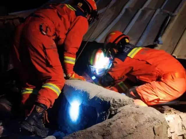 ▲12月19日,在甘肃临夏积石山县大河家镇康吊村二社,消防救援人员对两名被困人员进行救援(图源:新华社)