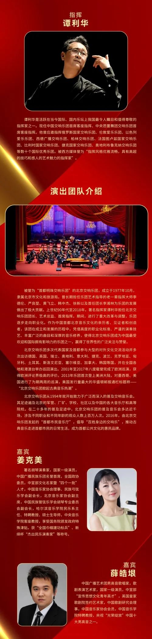 本场演出邀请到北京新年音乐会的老朋友——著名指挥家谭利华和北京交响乐团。二者都曾亮相首届北京新年音乐会,并连续11年陪伴首都观众共度新年。本次音乐会是谭利华第12次指挥北京新年音乐会,也是时隔16年的再次回归。北京交响乐团将第15次亮相北京新年音乐会,也是在北京新年音乐会登台次数最多的乐团。