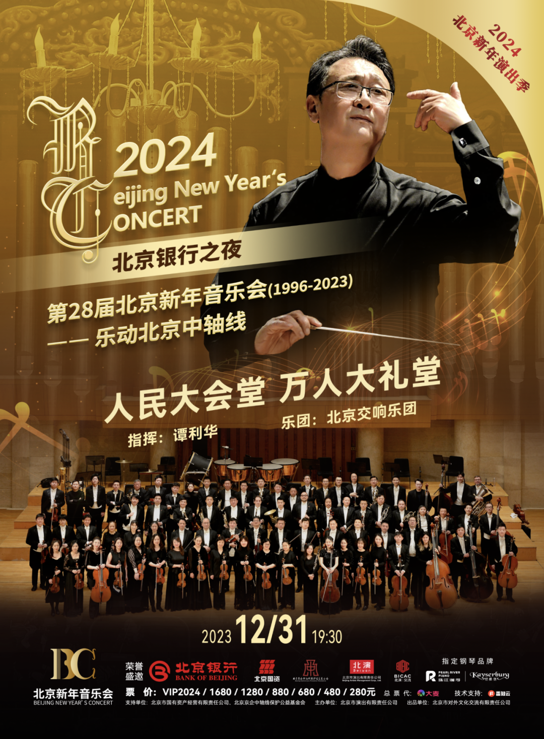 2023年12月31日,演出季重磅演出“北京银行之夜”第28届北京新年音乐会(1996-2023)——乐动北京中轴线将在人民大会堂万人大礼堂隆重上演。时隔四年,北京新年音乐会将延续“名团、名家、名曲”和“国际水准、中国气派、北京特色、节日气氛”的品牌策划创意理念和品牌特征,在“老时间、老地点”再度回归。