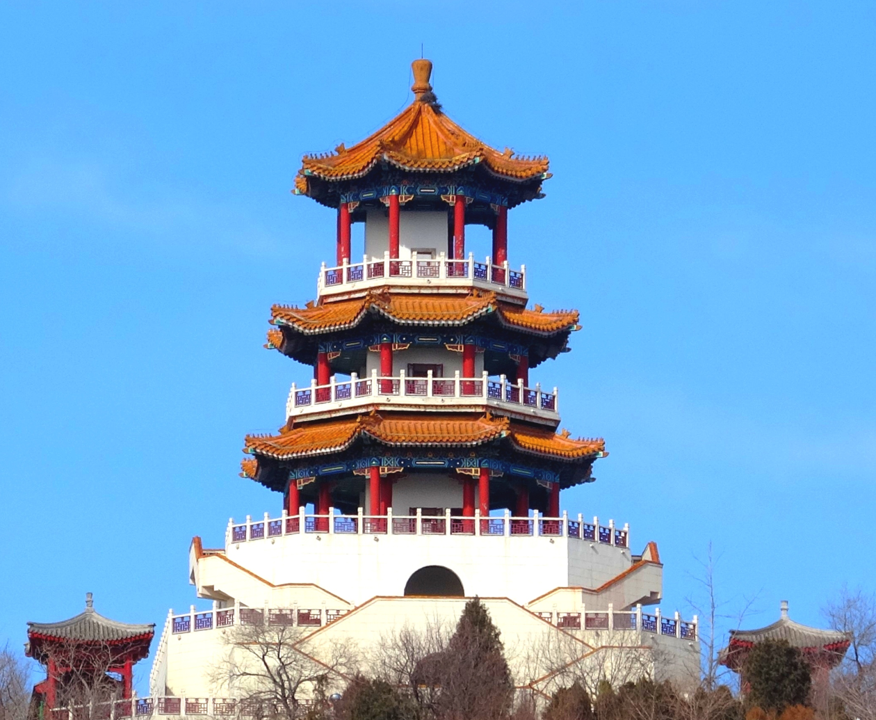 如今市民能够看到的功碑阁是一座近现代建筑,建筑本体高度55.25米,一至二层为八边形双层廊道结构,三至五层为八边形开放式楼阁建筑。登上塔顶观景平台,视野开阔、景色宜人,东望有北京的城市美景尽收眼底,西眺是古老的永定河穿流而过,自然山色与人文建筑交相辉映,带给人们耳目一新的视觉体验。
