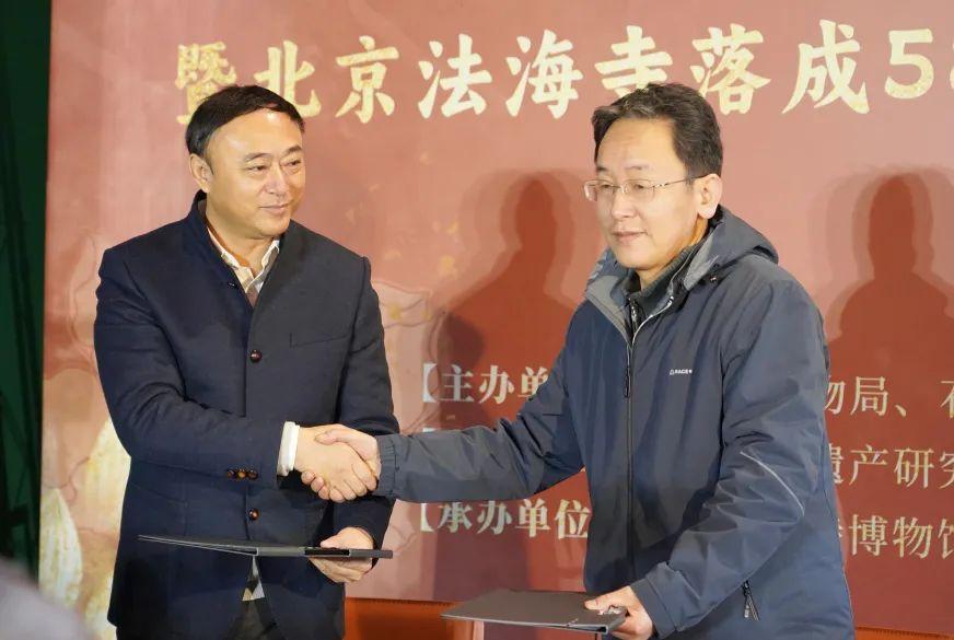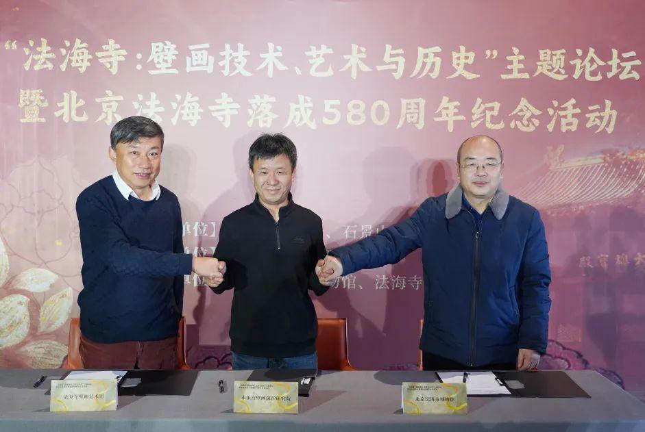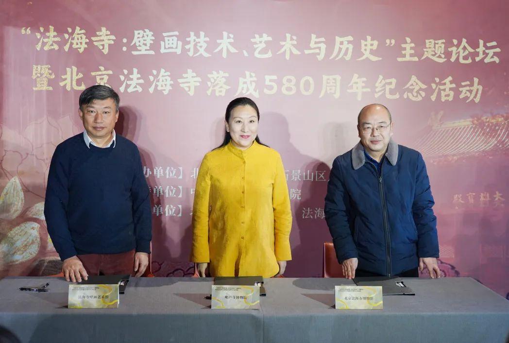 活动中,石景山区文化和旅游局与中国文化遗产研究院签署了战略合作协议,北京法海寺博物馆、法海寺壁画艺术馆分别与山西省永乐宫壁画保护研究院和石家庄市毗卢寺博物院签署三方战略合作协议,各方将在文化遗产发展、文化科技艺术价值、文物保护利用等方面加强合作交流。